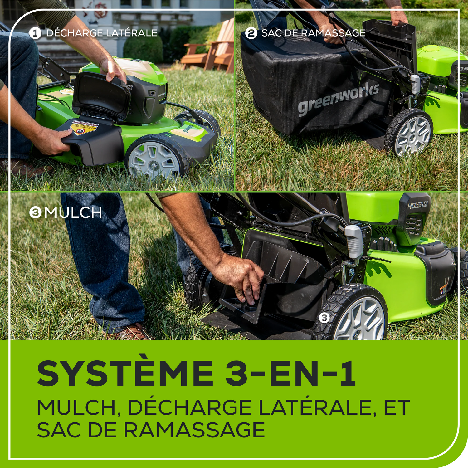 - CHOISISSEZ VOTRE FAÇON Le carter de coupe 3 en 1 pratique vous permet de choisir votre finition de coupe : mulching, ensachage ou éjection latérale.