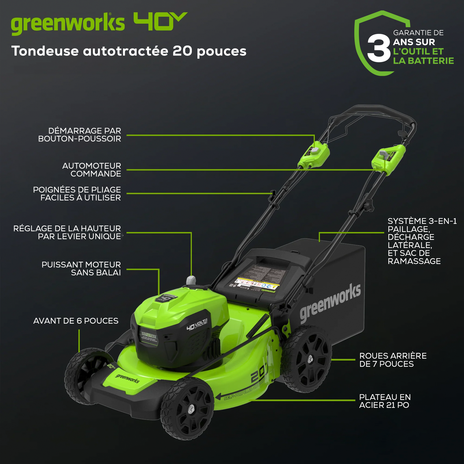 Bienvenue à La Vie. Propulsée. Par Greenworks. Donnez un coup de pouce au trottoir et passez au vert sans fumées, sans mélange, sans entretien et sans cordons de traction. La plate-forme lithium-ion Greenworks 40 V alimente plus de 60 produits, notamment des tondeuses, des souffleurs, des coupe-herbes, des scies à chaîne, des taille-haies et bien plus encore ! Offre la puissance dont vous avez besoin avec des performances sans décoloration et sans perte de mémoire après la charge. Laissez Greenworks vous aider à simplifier les travaux de jardinage. Tondez votre pelouse facilement grâce à la tondeuse autotracée Greenworks 40 V 20 po, batterie 5,0 Ah et chargeur inclus. Cette tondeuse sans fil fonctionnant sur batterie comprend un carter en acier, 7 hauteurs de coupe, la technologie innovante SmartCut et un démarrage par bouton-poussoir. et poignées pliantes pour un rangement compact. Construit pour durer; La plateforme Greenworks 40 V est accompagnée d'une garantie de 3 ans sur les outils et la batterie pour protéger votre investissement.