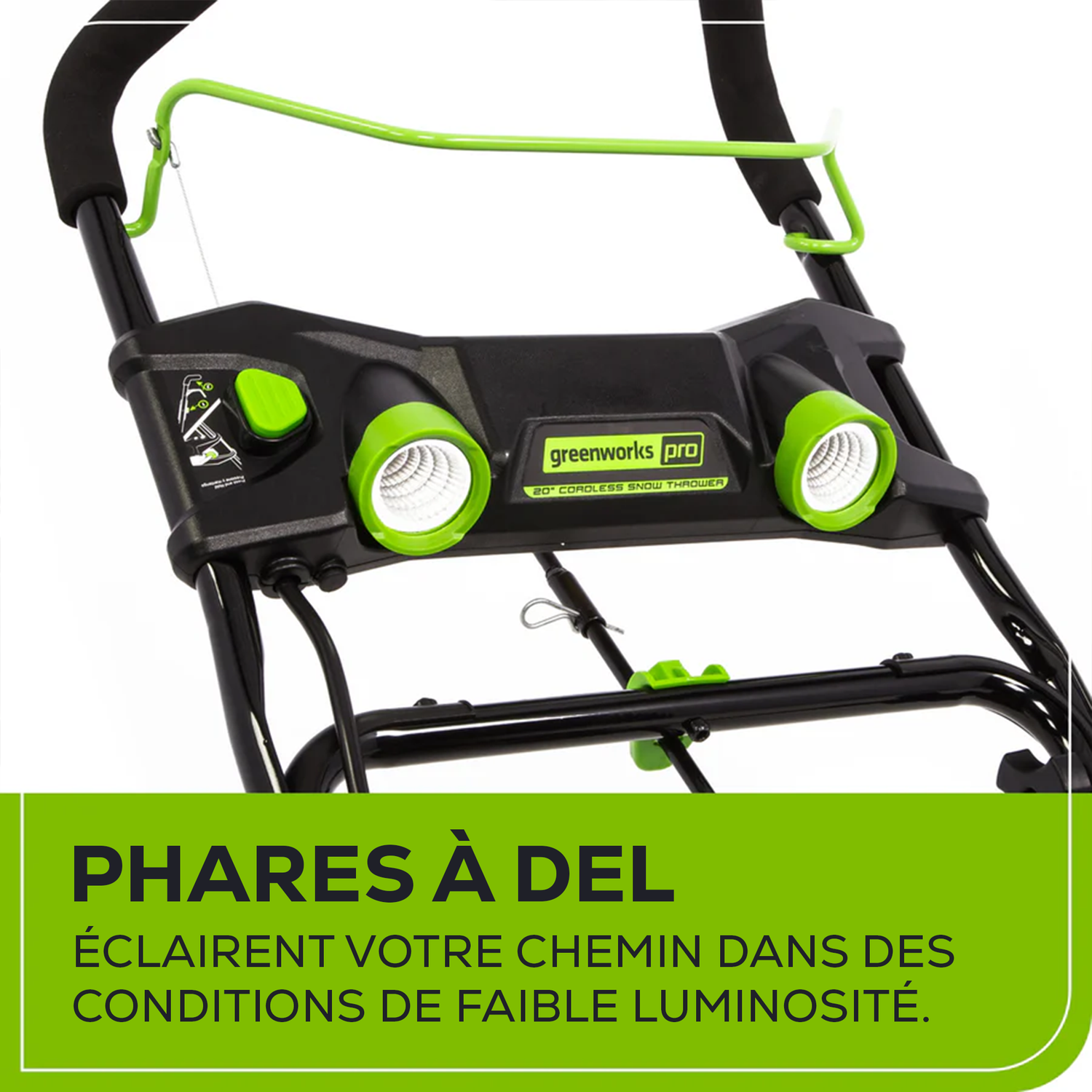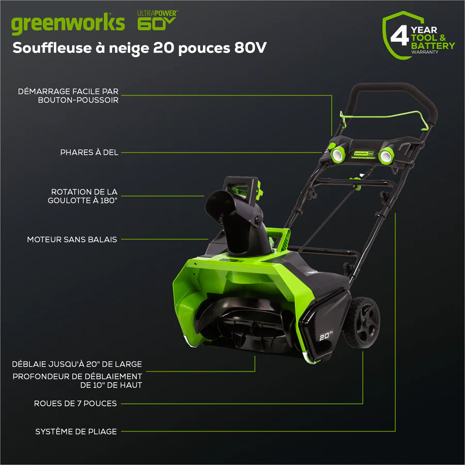 Bienvenue à La Vie. Propulsée. Par Greenworks. Idéale pour déneiger les trottoirs, les allées et les patios, cette souffleuse à neige Greenworks Pro 60 V est l'outil à avoir lorsque la neige tombe. Cette souffleuse à neige à phase unique est alimentée par une batterie de 60 V qui permet un fonctionnement sans fil facile et pratique ; commencez avec une trousse à outils, puis ajoutez un équipement contenant uniquement des outils. Cette souffleuse à neige est compatible avec toutes les batteries Greenworks 60V. Avec la goulotte rotative à 180°, vous pouvez projeter la neige jusqu'à 20' dans la direction souhaitée. Pour le dégagement de nuit, cette souffleuse est dotée de deux DEL pour augmenter la visibilité, et ses roues arrière de 7 po. la rendent facile à manœuvrer. De plus, son système de pliage convivial facilite le rangement ou le transport. Équipez-vous cet hiver du Greenworks Pro Souffleuse à neige 60 V et passez moins de temps à pelleter la neige et plus de temps à profiter d'un feu chaud. Bénéficiant d'une garantie de 4 ans, cette souffleuse à neige est construite pour une durabilité durable, garantissant qu'elle reste fiable pour les années à venir.
