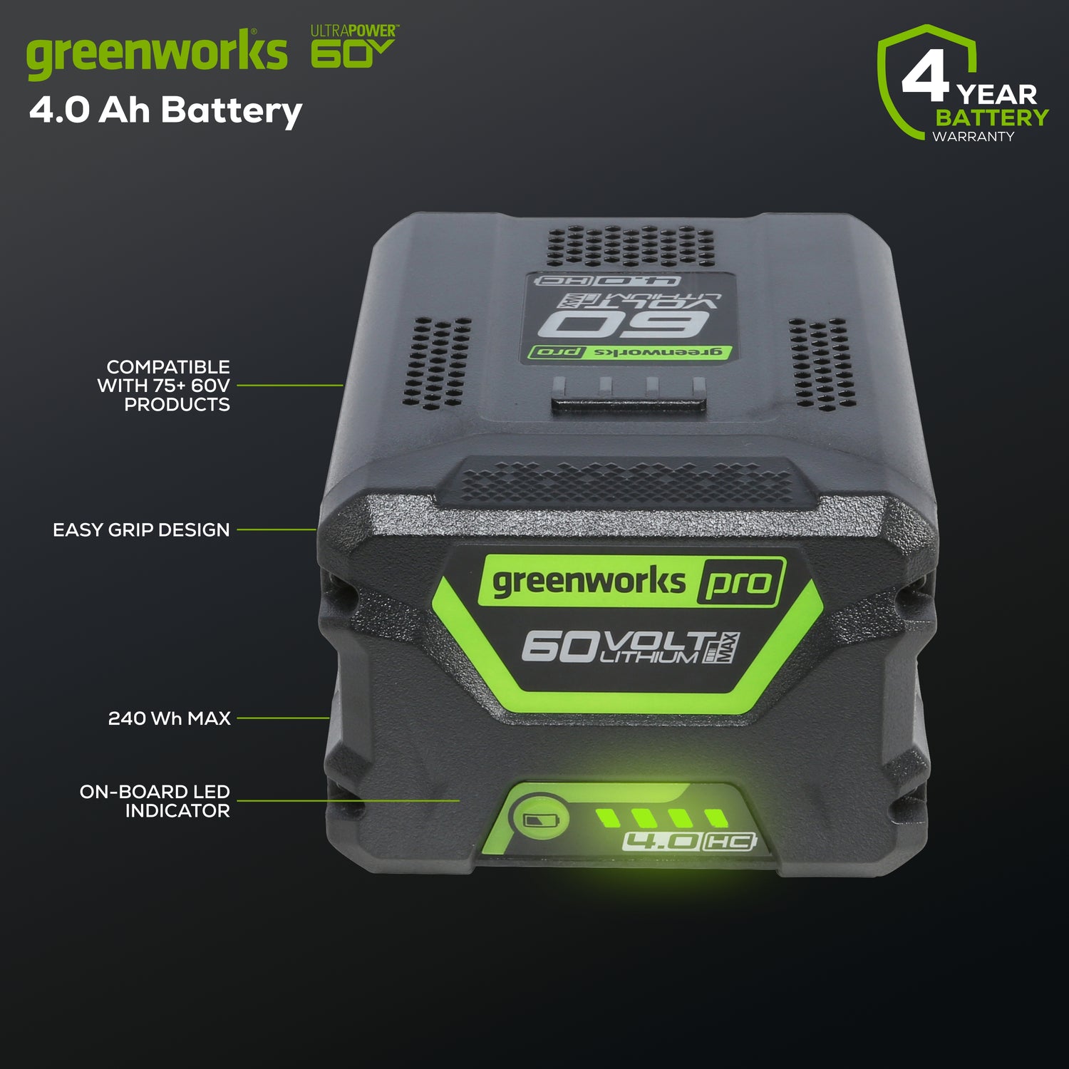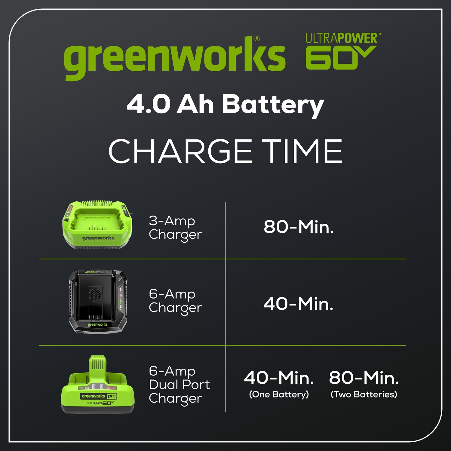 - La batterie Greenworks Pro 60V UltraPower™ fournit une puissance constante sans perte de mémoire après la charge
