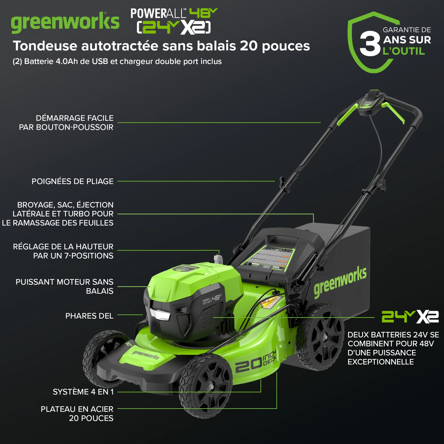 Bienvenue à La Vie. Propulsée. Par Greenworks. La plateforme lithium-ion Greenworks 24 V PowerAll™ alimente plus de 125 produits 24 V intérieurs et extérieurs, notamment des tondeuses, des souffleurs, des coupe-herbes, des scies à chaîne, des outils électroportatifs et bien plus encore ! Nos batteries 24 V fournissent 20 % de puissance en plus et 35 % d'autonomie en plus, et offrent une puissance sans décoloration et sans perte de mémoire après la charge. Donnez un coup de pouce au trottoir et passez au vert sans fumées, sans mélange, sans entretien et sans cordons de traction. Laissez Greenworks vous aider à simplifier les travaux de jardinage. Gardez votre pelouse incroyable avec la tondeuse automotrice sans balais Greenworks 2 x 24 V (48 V) 20 pouces (2) batteries USB 5 Ah et chargeur double port 4 A. Cette tondeuse à gazon sans fil fonctionnant sur batterie est dotée d'un carter en acier, de 7 hauteurs de coupe et de la technologie innovante SmartCut, démarrage par bouton-poussoir et poignées rabattables pour un rangement compact lorsque vous recherchez des outils et des équipements électriques d'extérieur, nous savons que vous pensez à la qualité. C'est pourquoi Greenworks soutient nos outils 24 V avec une garantie limitée de 3 ans sur les outils et la batterie.