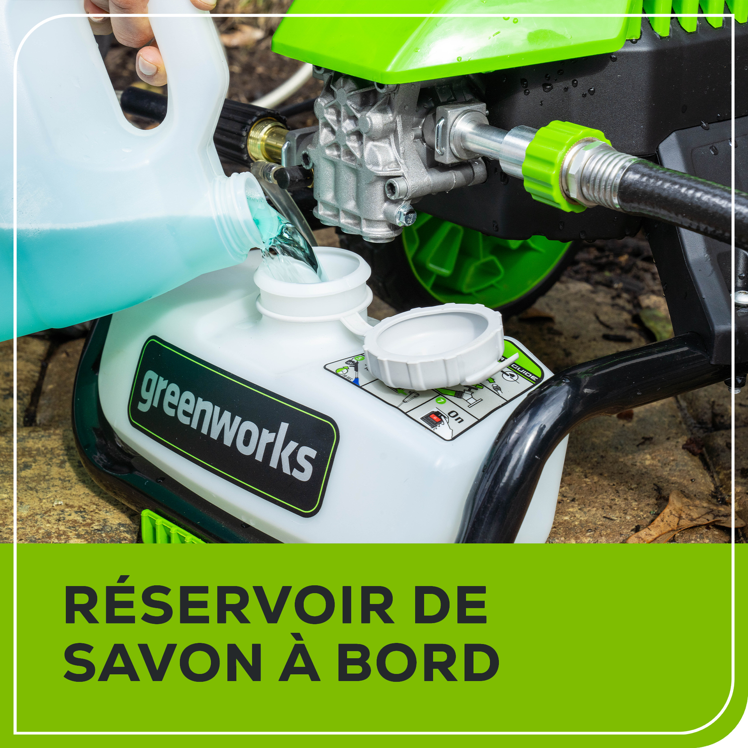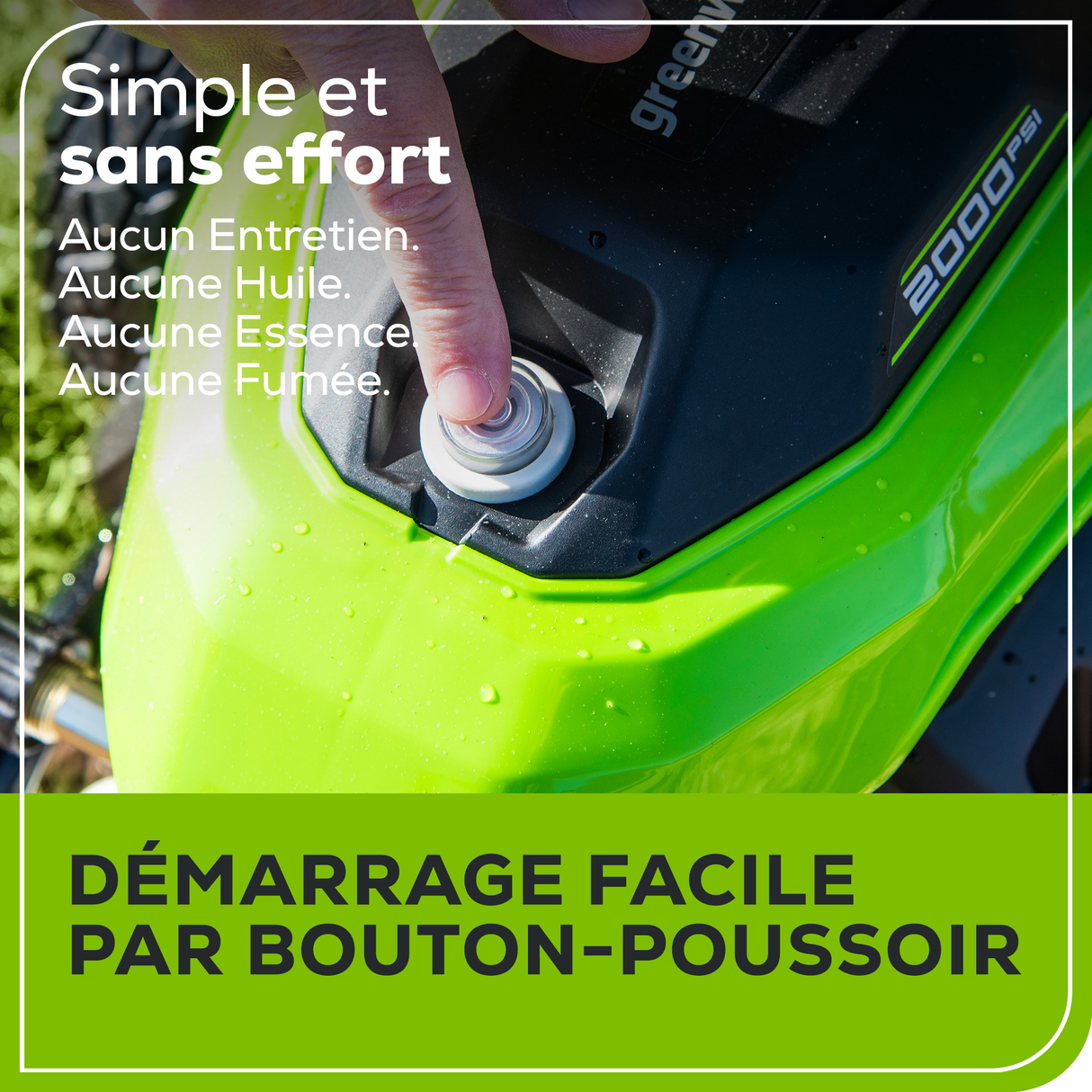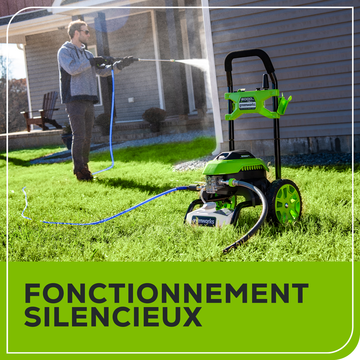 Bienvenue à La Vie. Propulsé. Par Greenworks. Les laveuses à pression résidentielles à batterie les plus puissants au monde ! Le nettoyage ménager intensif nécessite des outils aussi sérieux que vous. Qu'il s'agisse de la voiture, de la maison, de la terrasse ou de l'entrée, vos affaires brilleront à coup sûr. La laveuse à pression électrique à eau froide Greenworks Pro 2 000 PSI (lb/po²) 1,2 GPM ne manquera pas d'impressionner. Bénéficiant d'un débit d'eau allant jusqu'à 1,2 GPM, elle est puissante, fiable et conçue pour les tâches de nettoyage les plus difficiles. Avec un démarrage par bouton-poussoir sans tracas, elle s'allume facilement et se met au travail rapidement. Avec un pistolet pulvérisateur en métal robuste, elle est solide et durable, et la pompe est dotée d'un revêtement anodisé résistant à la corrosion. Elle est équipée d'un cordon d'alimentation extra-long de 35 pieds avec un disjoncteur différentiel de fuite à la terre (DDFT) en ligne et d'un boyau anti-pliage sans tracas qui élimine les enchevêtrements de boyaux frustrants, de roues increvables de 10 pouces pour un transport facile et d'un rangement d'accessoires à bord. Bénéficiant d'une garantie outil de 3 ans, la meilleure du secteur, elle est conçue pour durer des années.