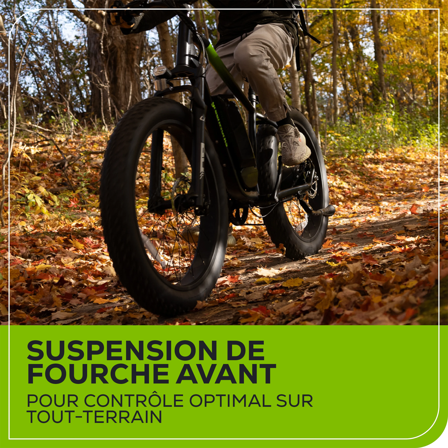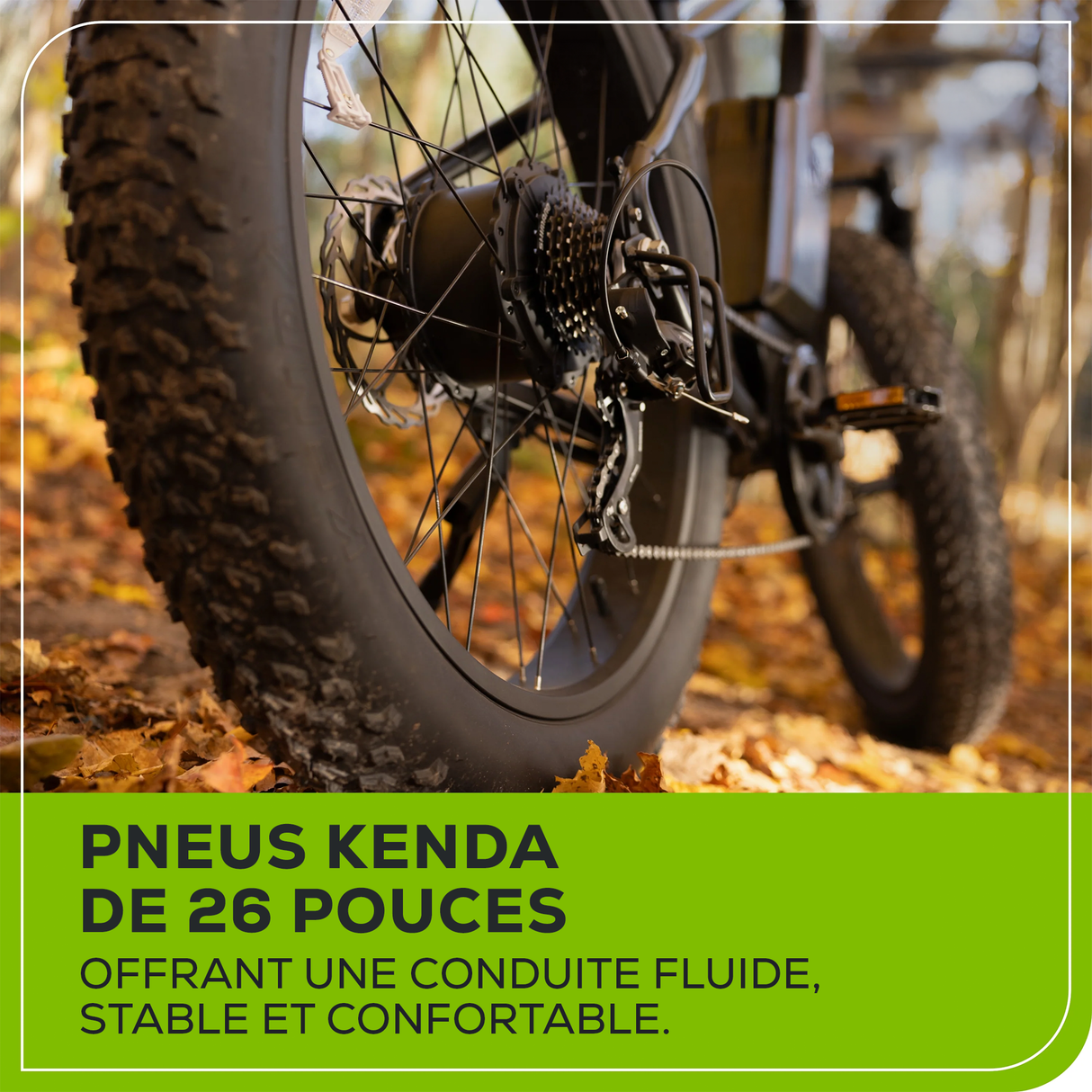 Bienvenue à La Vie. Propulsée. par Greenworks. Découvrez l'avenir de la mobilité électrique avec Greenworks, où innovation rime avec aventure. Le VTT électrique tout-terrain Greenworks 80 V 26 pouces à gros pneus est équipé d'un puissant moteur brushless de 500 W dans le moyeu arrière, vous propulsant sans effort jusqu'à 32 km/h. Ses gros pneus Kenda de 26 pouces sont conçus pour conquérir tous les terrains, garantissant une conduite fluide et stable. Le profil large des pneus offre une traction et une absorption des chocs supérieures, vous donnant confiance sur le sable, la neige, le gravier ou le bitume. Avec une garantie d'un an sur l'outil et de quatre ans sur la batterie, roulez en toute confiance et tranquillité d'esprit. Vivez les sensations fortes du plein air et redéfinissez votre aventure avec Greenworks !