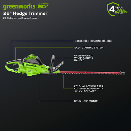 Taille-haie 60 V Pro, 26 pouces, batterie 2,0 Ah et chargeur