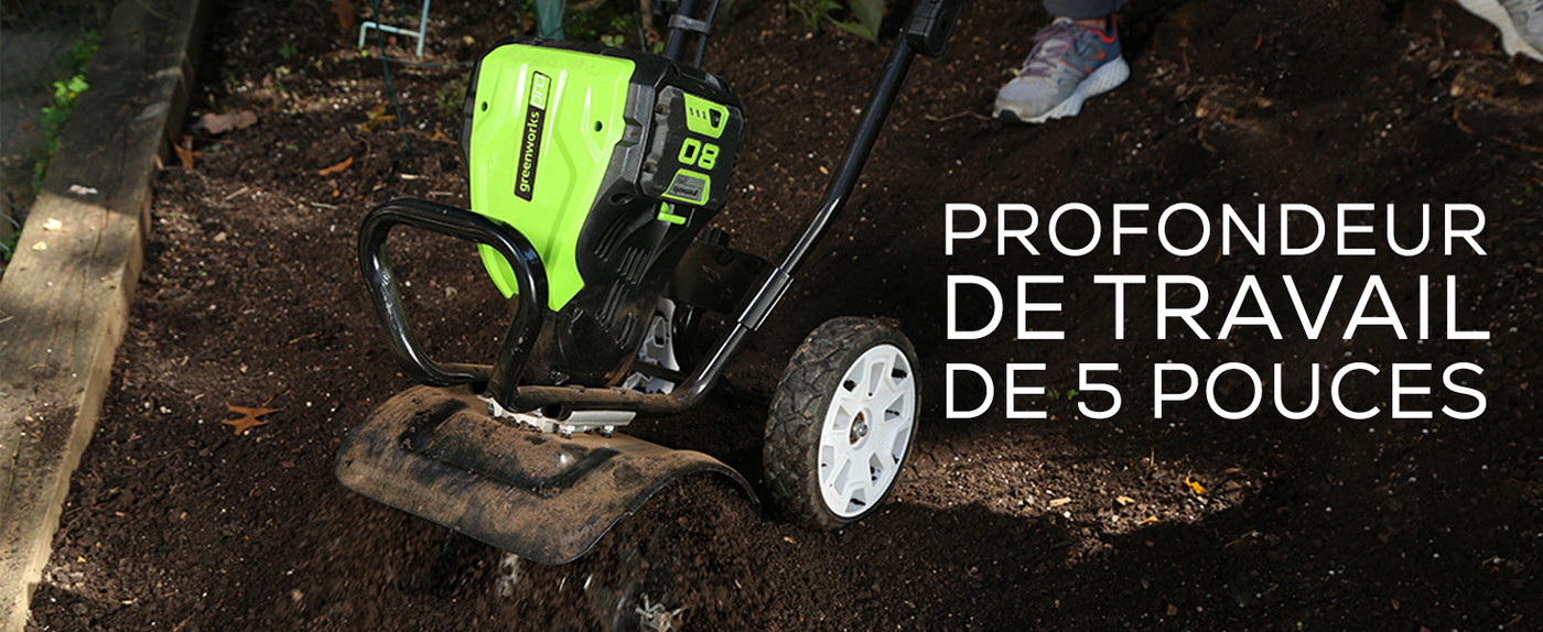 Selon les conditions du sol, le cultivateur descendra jusqu'à une profondeur de 5 pouces. Nous conseillons d'enlever les pierres et les racines avant de cultiver pour éviter d'endommager l'appareil.
