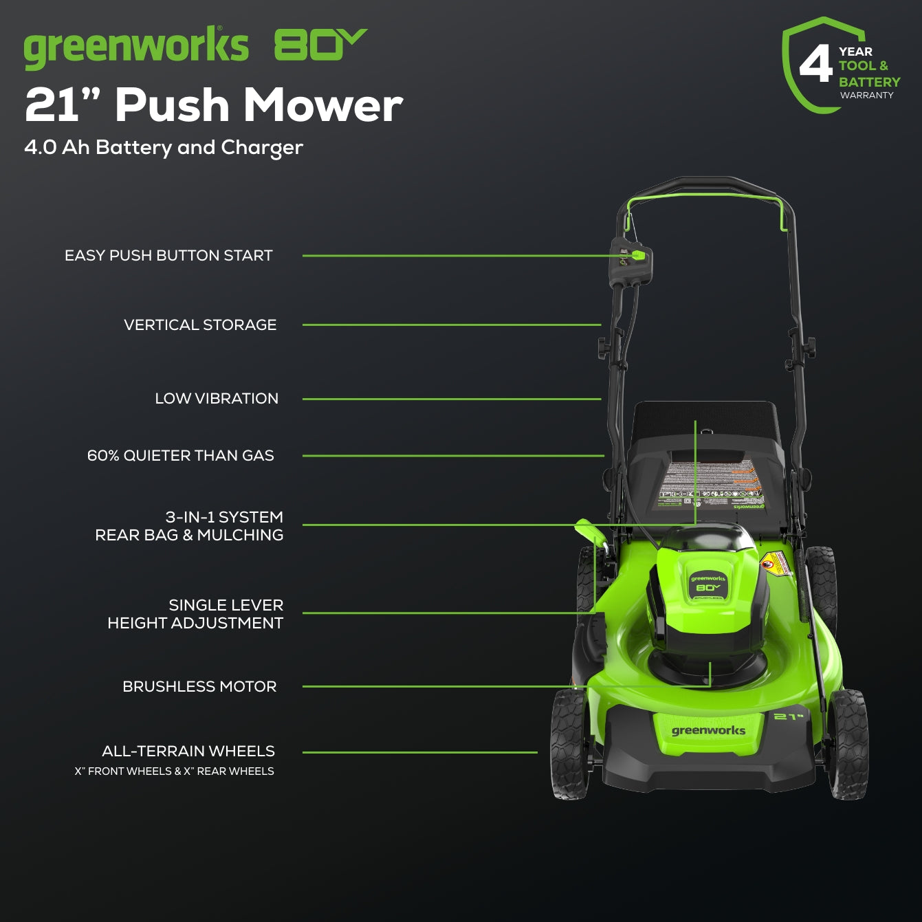 Tondeuse à batterie 80 V, 21 pouces – Sans balais, batterie 4,0 Ah et chargeur inclus