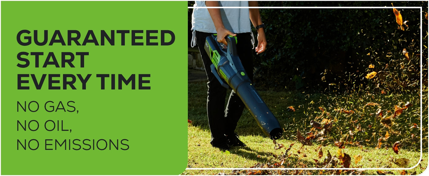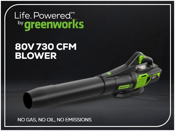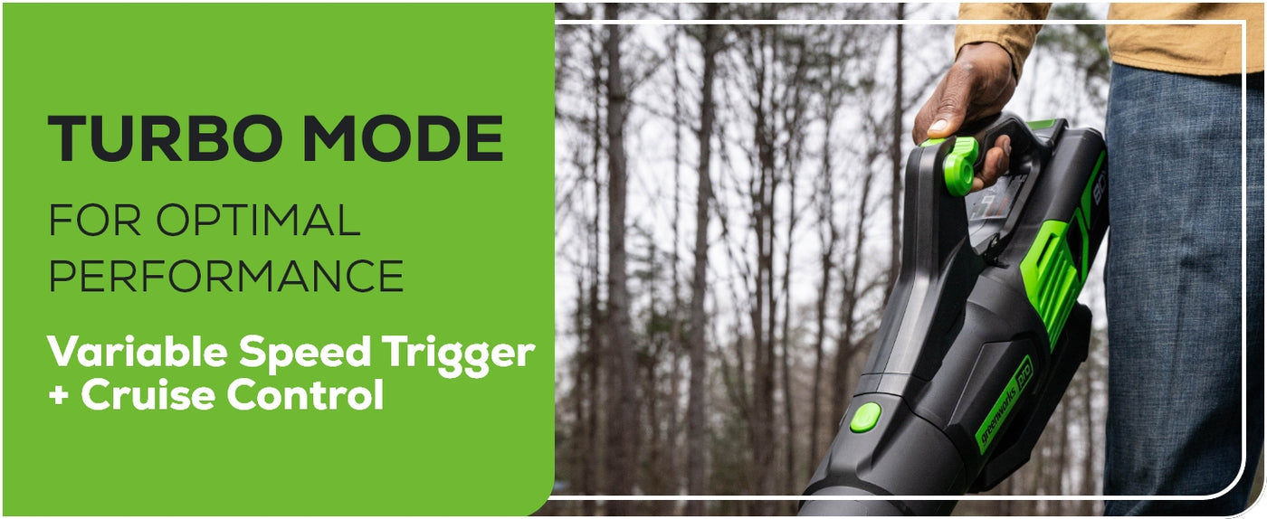 Alimenté par une batterie lithium-ion de 80 V de qualité professionnelle, le nouveau souffleur à batterie Greenworks offre une puissance et des performances typiques des souffleurs à essence, sans tout le bruit, les fumées ou les émissions nocives. Avec l'incroyable force de soufflage d'une vitesse d'air maximale de 155 MPH et un volume d'air maximum de 650 CFM (pi³/min). Il est doté de notre technologie Jet Fan et est équipé d'un bouton turbo, d'un contrôle de vitesse variable activé par la gâchette et d'un régulateur de vitesse. Ce souffleur compact et léger démarre en appuyant sur une gâchette, sans cordon de traction aggravant. De plus, vous n'avez pas à vous soucier de renverser, de mélanger ou de stocker de l'huile et du carburant.