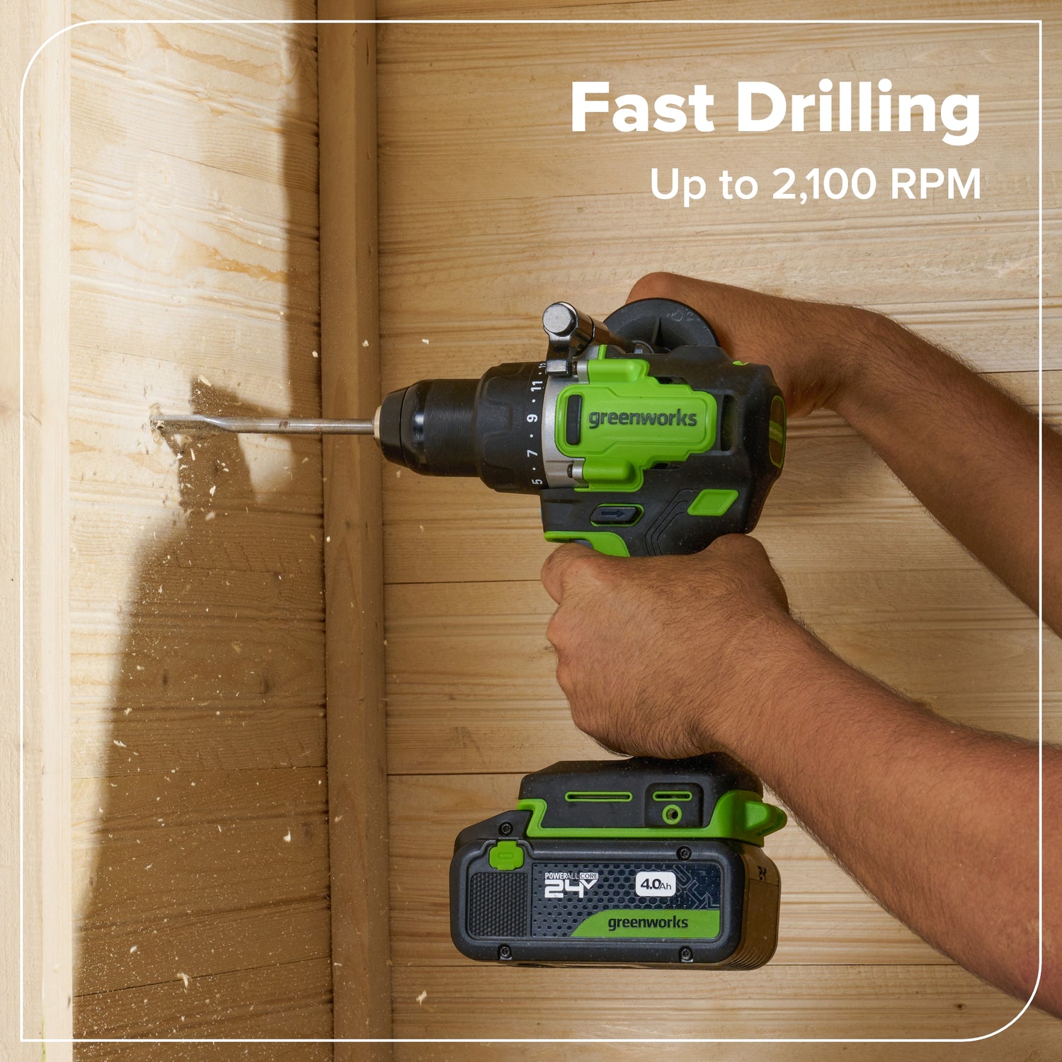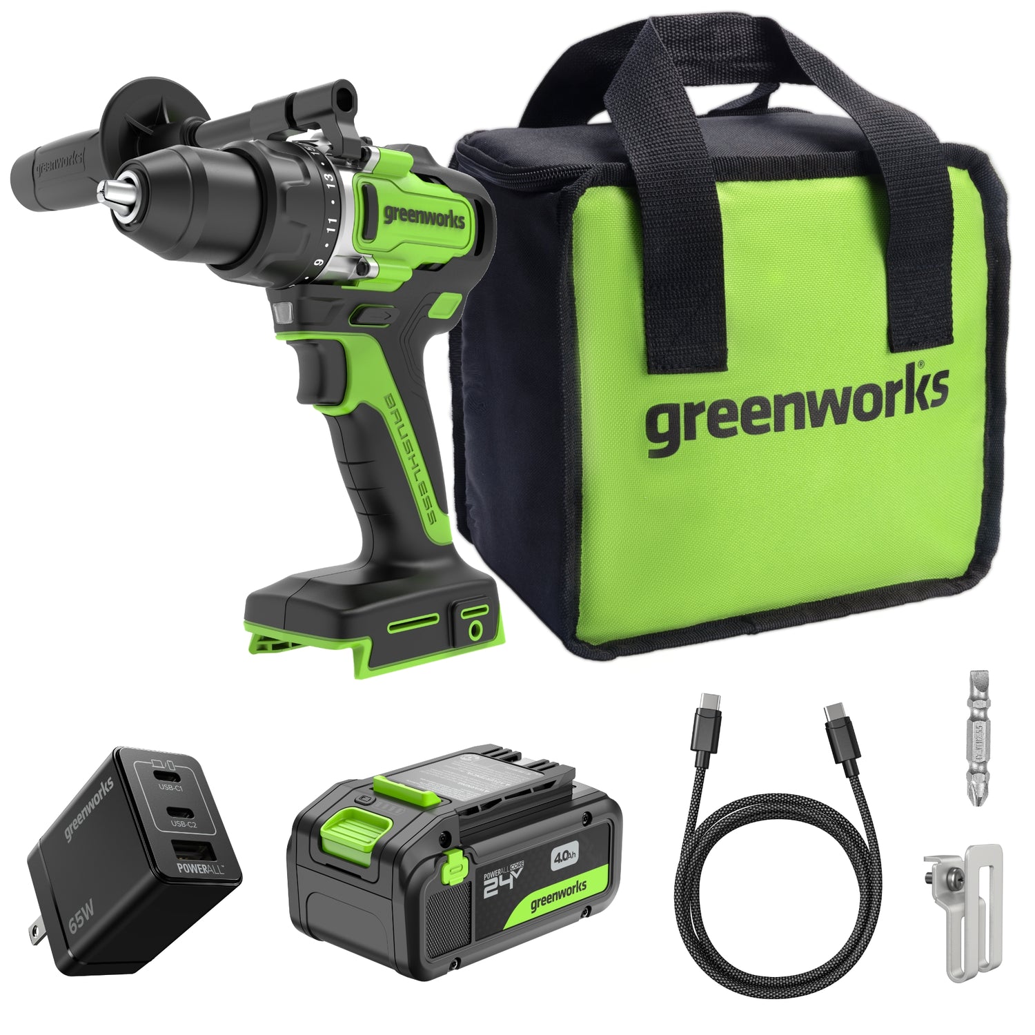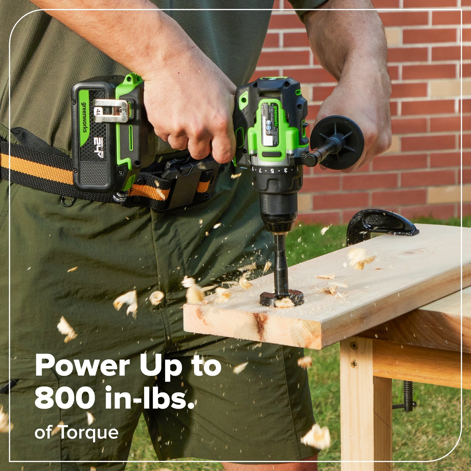 Bienvenue à La Vie. Propulsée. Par Greenworks. Réalisez tous vos projets en toute simplicité grâce à la perceuse-visseuse sans fil 24 V de 13 mm (1/2 po.). Offrant un couple maximal de 800 po-lb, elle est équipée d'un mandrin métallique à cliquet sans clé de 13 mm (1/2") pour un changement de foret rapide et facile, ainsi que d'un variateur de vitesse pour une précision optimale. Alimentée par une batterie USB-C de 4,0 Ah, elle garantit une utilisation efficace et une autonomie maximale. Le chargeur rapide USB-C de 65 W inclus assure une recharge rapide, et la batterie peut également servir de batterie externe USB-C pour recharger téléphones, tablettes et autres appareils. Compacte, légère et conçue pour un confort d'utilisation optimal, cette perceuse-visseuse est idéale pour le bricolage, les travaux de rénovation ou les projets professionnels. Bénéficiant d'une garantie limitée de 3 ans sur l'outil et la batterie, elle offre des performances fiables et durables.
