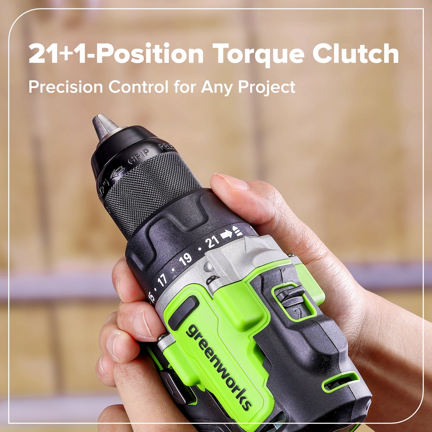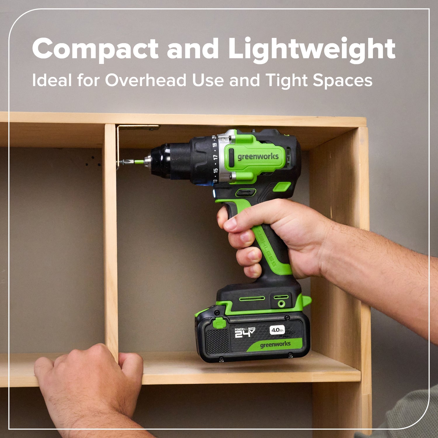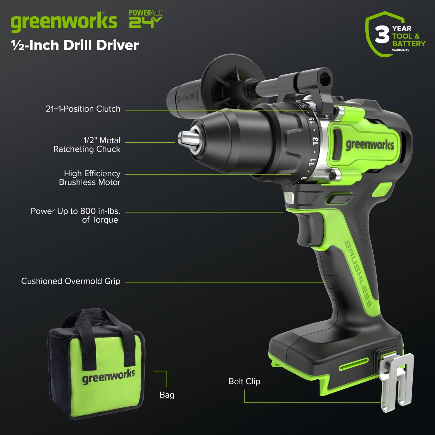 Bienvenue à La Vie. Propulsée. Par Greenworks. Réalisez tous vos projets en toute simplicité grâce à la perceuse-visseuse sans fil 24 V de 13 mm (1/2 po.). Offrant un couple maximal de 800 po-lb, elle est équipée d'un mandrin métallique à cliquet sans clé de 13 mm (1/2") pour un changement de foret rapide et facile, ainsi que d'un variateur de vitesse pour une précision optimale. Alimentée par une batterie USB-C de 4,0 Ah, elle garantit une utilisation efficace et une autonomie maximale. Le chargeur rapide USB-C de 65 W inclus assure une recharge rapide, et la batterie peut également servir de batterie externe USB-C pour recharger téléphones, tablettes et autres appareils. Compacte, légère et conçue pour un confort d'utilisation optimal, cette perceuse-visseuse est idéale pour le bricolage, les travaux de rénovation ou les projets professionnels. Bénéficiant d'une garantie limitée de 3 ans sur l'outil et la batterie, elle offre des performances fiables et durables.