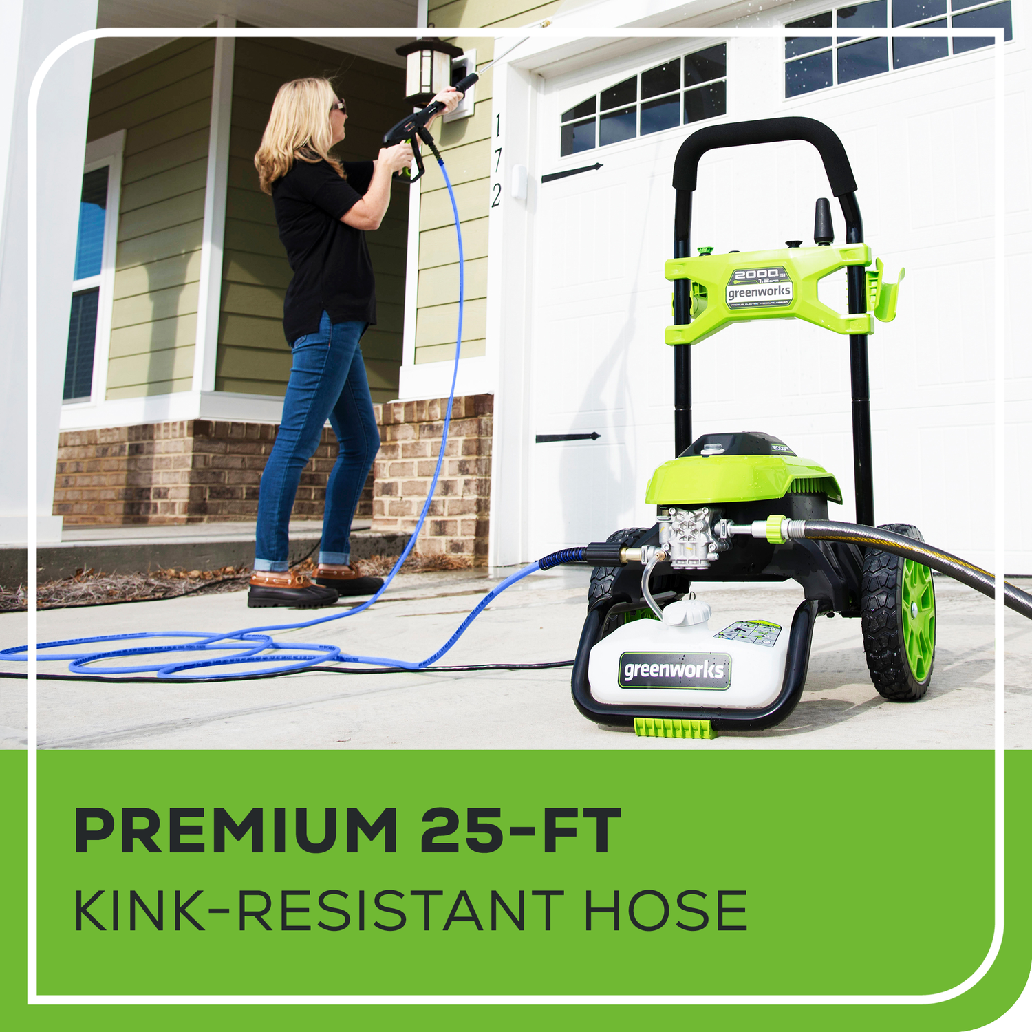Bienvenue à La Vie. Propulsé. Par Greenworks. Les laveuses à pression résidentielles à batterie les plus puissants au monde ! Le nettoyage ménager intensif nécessite des outils aussi sérieux que vous. Qu'il s'agisse de la voiture, de la maison, de la terrasse ou de l'entrée, vos affaires brilleront à coup sûr. La laveuse à pression électrique à eau froide Greenworks Pro 2 000 PSI (lb/po²) 1,2 GPM ne manquera pas d'impressionner. Bénéficiant d'un débit d'eau allant jusqu'à 1,2 GPM, elle est puissante, fiable et conçue pour les tâches de nettoyage les plus difficiles. Avec un démarrage par bouton-poussoir sans tracas, elle s'allume facilement et se met au travail rapidement. Avec un pistolet pulvérisateur en métal robuste, elle est solide et durable, et la pompe est dotée d'un revêtement anodisé résistant à la corrosion. Elle est équipée d'un cordon d'alimentation extra-long de 35 pieds avec un disjoncteur différentiel de fuite à la terre (DDFT) en ligne et d'un boyau anti-pliage sans tracas qui élimine les enchevêtrements de boyaux frustrants, de roues increvables de 10 pouces pour un transport facile et d'un rangement d'accessoires à bord. Bénéficiant d'une garantie outil de 3 ans, la meilleure du secteur, elle est conçue pour durer des années.