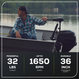 • PUISSANCE Conçu pour les bateaux de petite et moyenne taille, ce moteur de pêche à la traîne offre une poussée impressionnante de 32 lbs. (14,5 kg). Équipé d'un arbre composite robuste de 36 pouces (91 cm), il est conçu pour résister aux rigueurs des aventures en plein air tout en assurant des performances fiables sur l'eau.