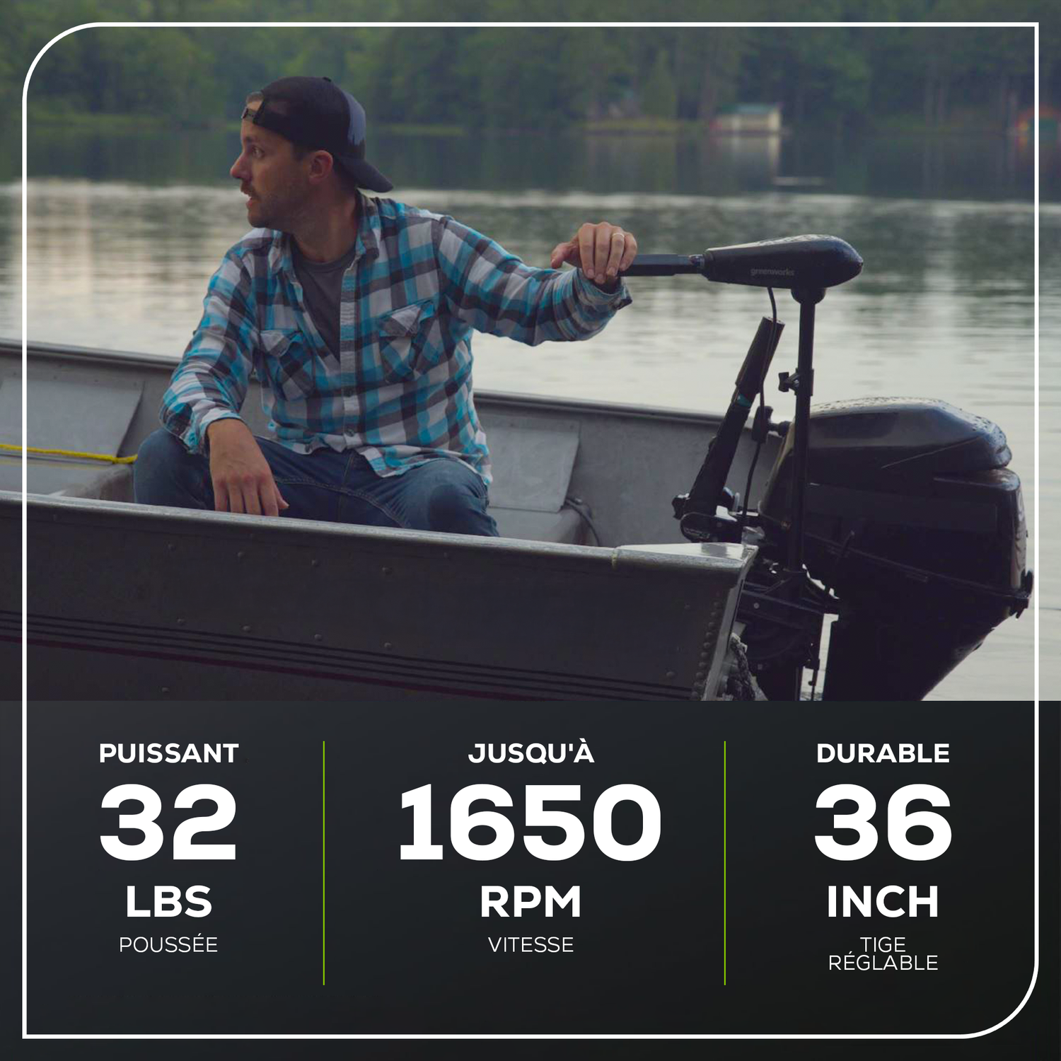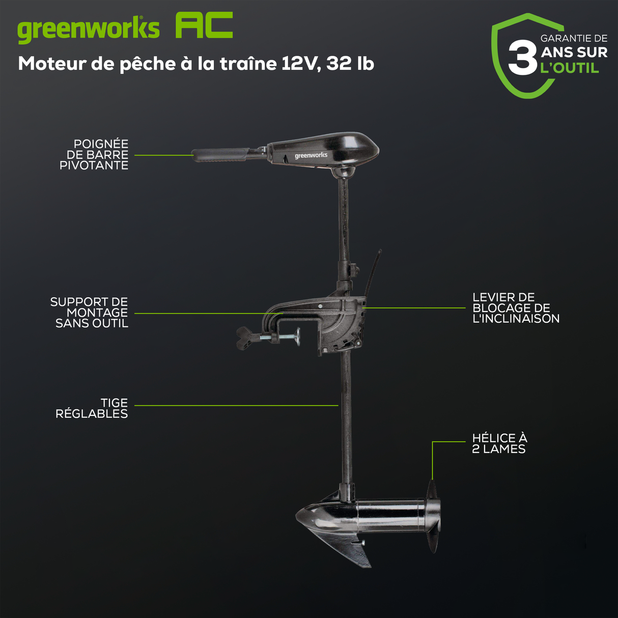 Bienvenue à La Vie. Propulosée. Par Greenworks. Découvrez le moteur de pêche à la traîne à batteries Greenworks 12 V, 32 lbs. (Outil seulement) : le choix idéal pour une navigation efficace et respectueuse de l'environnement, parfait pour les passionnés de pêche. Conçu pour fonctionner avec une batterie marine à décharge profonde (vendue séparément), ce moteur 12 V offre une puissance fiable pour vous emmener en toute sérénité vers vos lieux de pêche préférés. Son moteur haute performance atteint des vitesses impressionnantes jusqu'à 1 650 tr/min, vous permettant de naviguer sans effort dans diverses conditions d'eau. Bénéficiant d'une garantie de 3 ans, vous pouvez compter sur sa durabilité et son assistance pour de nombreuses années de sorties en mer. Améliorez votre expérience nautique avec Greenworks : performance, durabilité et satisfaction du pêcheur réunies.