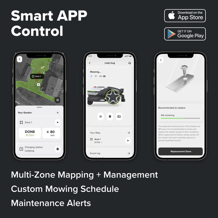 Customize mowing zones, schedules, and no-go areas through the Greenworks app for precise, property-specific lawn care.
