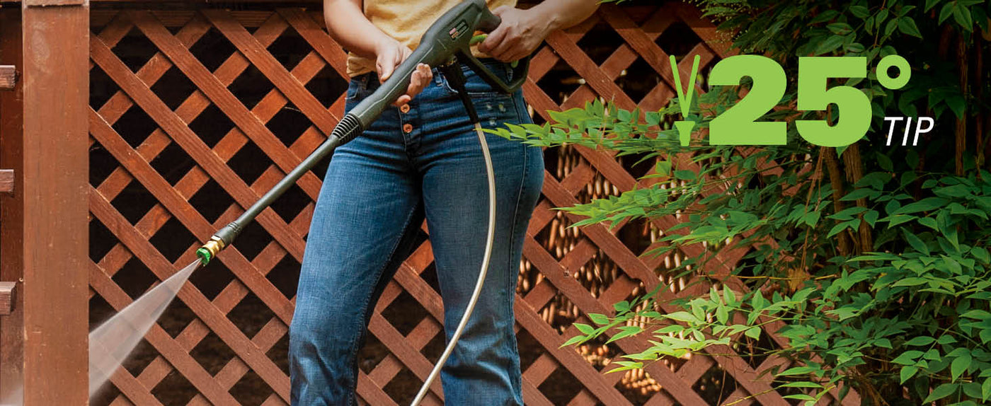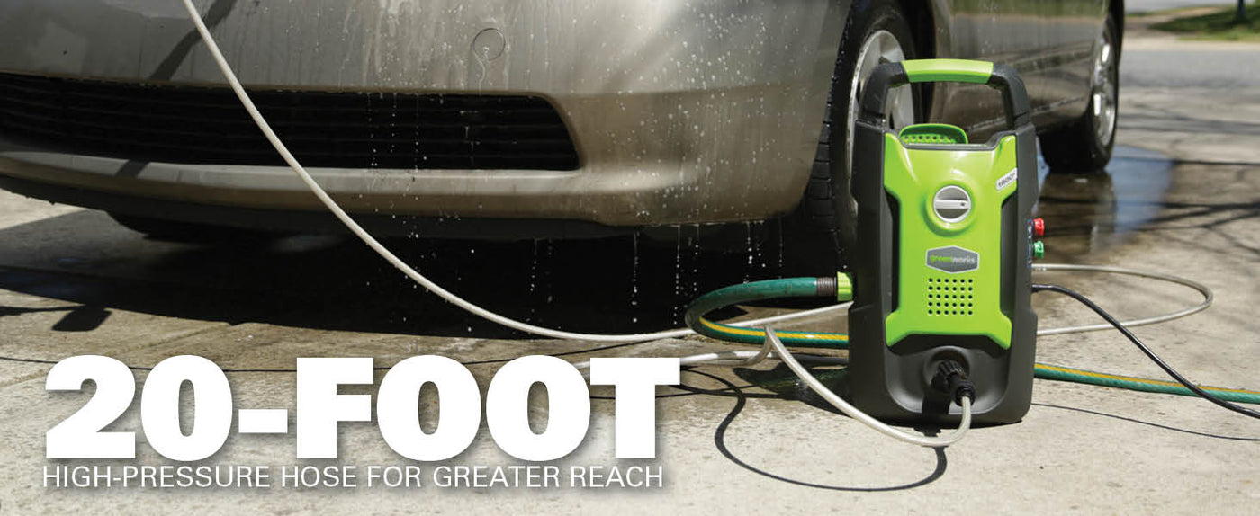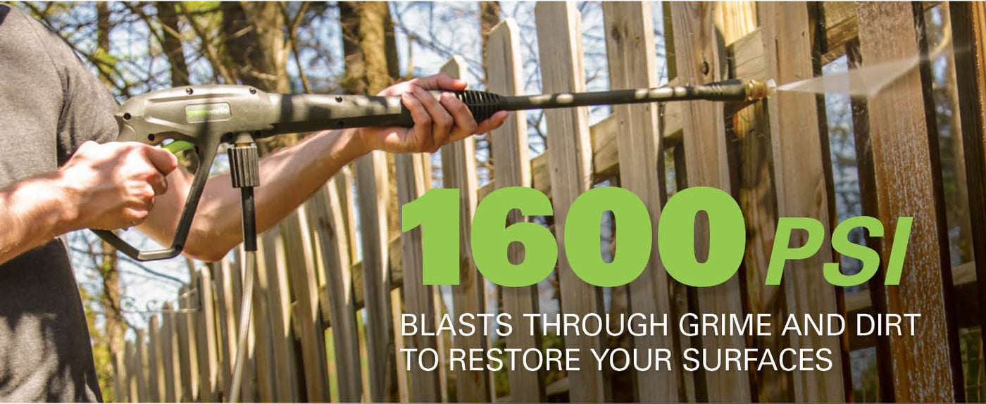 Bienvenue à La Vie. Propulsée. Par Greenworks. Les laveuses à pression électriques résidentielles les plus puissantes au monde ! Un bel ajout à votre collection d'outils, cette laveuse électrique est idéale pour les travaux quotidiens de nettoyage à haute pression dans la maison. Qu'il s'agisse de la voiture, de la maison, de la terrasse ou de l'entrée, vos affaires brilleront à nouveau. La laveuse à pression Greenworks 1600 PSI (lb/po²) 13 Amp 1,2 GPM impressionnera à coup sûr. Bénéficiant d'un débit d'eau allant jusqu'à 1,2 GPM, elle est puissant, fiable et conçu pour le nettoyage quotidien. Avec un démarrage par bouton-poussoir sans tracas, il se met sous tension facilement et se met au travail rapidement. Cet appareil comprend une variété d'embouts à connexion rapide et un accessoire pour savon pour une variété d'applications de nettoyage. Bénéficiant d'une garantie d'outil de 3 ans, il est conçu pour durer des années.