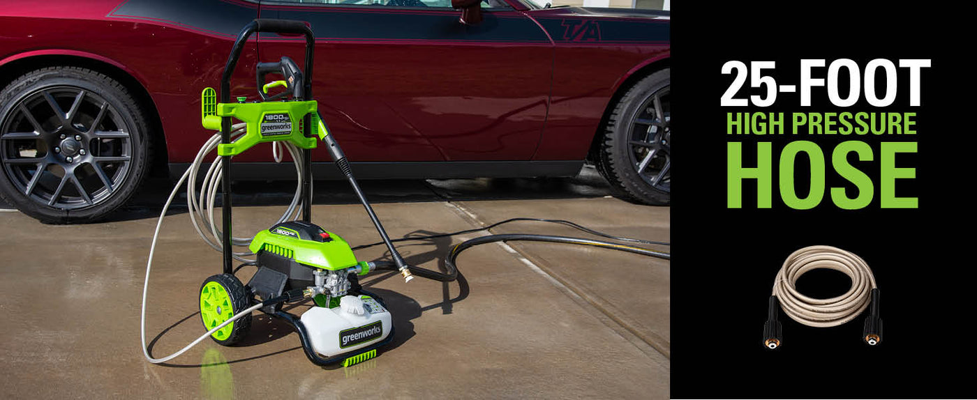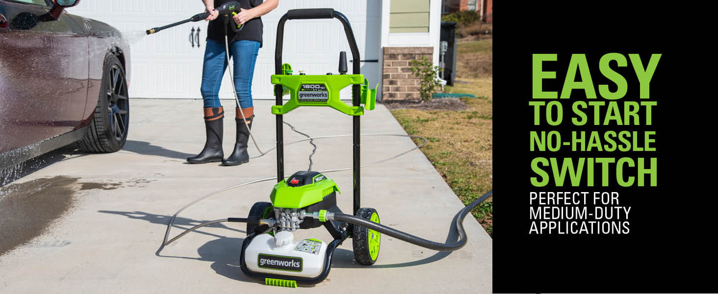 Bienvenue à La Vie. Propulsée. Par Greenworks. Les laveuses à pression électriques résidentielles les plus puissantes au monde ! Cette laveuse à pression électrique est idéal pour les travaux quotidiens de nettoyage à haute pression dans la maison. Qu'il s'agisse de la voiture, de la maison, de la terrasse ou de l'entrée, vos affaires brilleront à coup sûr. La laveuse à pression électrique à eau froide Greenworks 1800 PSI (lb/po²) 1,1 gallons GPM impressionnera à coup sûr. Bénéficiant d'un débit d'eau allant jusqu'à 1,1 GPM, il est puissant, fiable et conçu pour le nettoyage quotidien. Avec un démarrage par bouton-poussoir sans tracas, il se met sous tension facilement et se met au travail rapidement. Il est équipé d'un cordon d'alimentation extra-long de 35 pieds avec DDFT en ligne et d'une prise d'alimentation résistante à l'eau, d'un boyau résistant aux torsions sans tracas qui élimine les enchevêtrements frustrants, de roues jamais plates pour un transport facile, d'un volume important de 2 litres. réservoir de savon à bord et rangement d'accessoires à bord. Bénéficiant d'une garantie d'outil de 3 ans, il est conçu pour durer des années.
