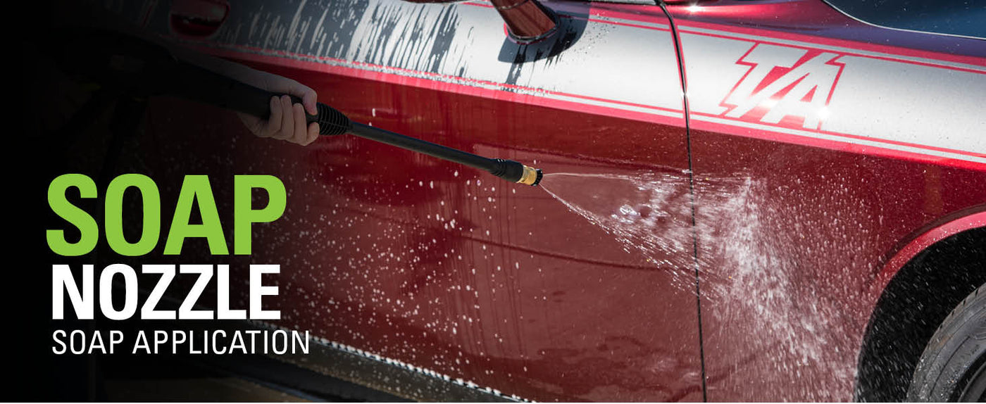 - SAVON Un réservoir de savon intégré de 2 litres et un stockage d'accessoires intégré permettent aux utilisateurs de basculer facilement entre l'application de savon et l'eau propre. Éteignez simplement la buse de savon pour rincer la buse de pulvérisation souhaitée.
