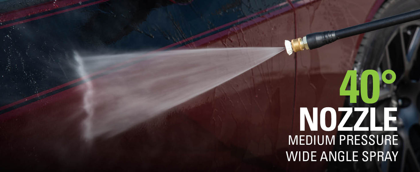 0° - Buse rouge : Cette buse est généralement utilisée pour éliminer les taches tenaces comme la rouille et les débris du béton et du métal. Vous pouvez également l'utiliser pour éliminer la boue incrustée des équipements de construction, agricoles ou de pelouse lourds. N'utilisez pas cette buse sur du bois ou des parements de maison ou pour laver une voiture, car ce jet est très fort et puissant et peut endommager une surface molle. 15° - Buse jaune : La buse jaune de laveuse à pression offre une grande polyvalence avec sa pointe à angle de 15°. Appelée pointe de lavage, car elle fournit une pression adéquate pour éliminer la saleté des surfaces, mais est conçue pour ne pas endommager de nombreuses surfaces. Cette buse de laveuse à pression est conçue pour « balayer » le feuillage ou les débris en raison de son grand angle. Cette pointe est polyvalente en raison de sa large zone de nettoyage et de sa forte application de pression. 25° - Buse verte : La buse verte à 25 degrés est idéale pour balayer la saleté et la boue. Utilisez-la pour balayer les feuilles des terrasses, des entrées, des allées et des trottoirs. Elle peut également être utilisée pour éliminer les taches de moisissure légères et éliminer les algues et les bactéries accumulées dans les piscines. 40° – Buse blanche : La pointe blanche à 40°, appelée pointe « en éventail », crée la zone de nettoyage la plus large avec une pression relativement faible. Cette pointe de laveuse à pression est idéale pour les applications de nettoyage légères ou délicates. Elle est recommandée pour un nettoyage léger sur les terrasses en bois et autres surfaces douces ou délicates. 75° Savon – Buse noire : La buse de couleur noire est une buse à détergent basse pression. Vous l'utilisez lorsque vous appliquez votre détergent préféré pour vos projets de nettoyage. Buse turbo : La buse tourne dans un motif de pulvérisation de zéro à 15° dans un mouvement circulaire pour décomposer la saleté et la crasse tenaces. Le motif de pulvérisation peut couvrir une zone de 4 à 8 pouces de large, selon la distance entre la pointe et la surface à nettoyer.