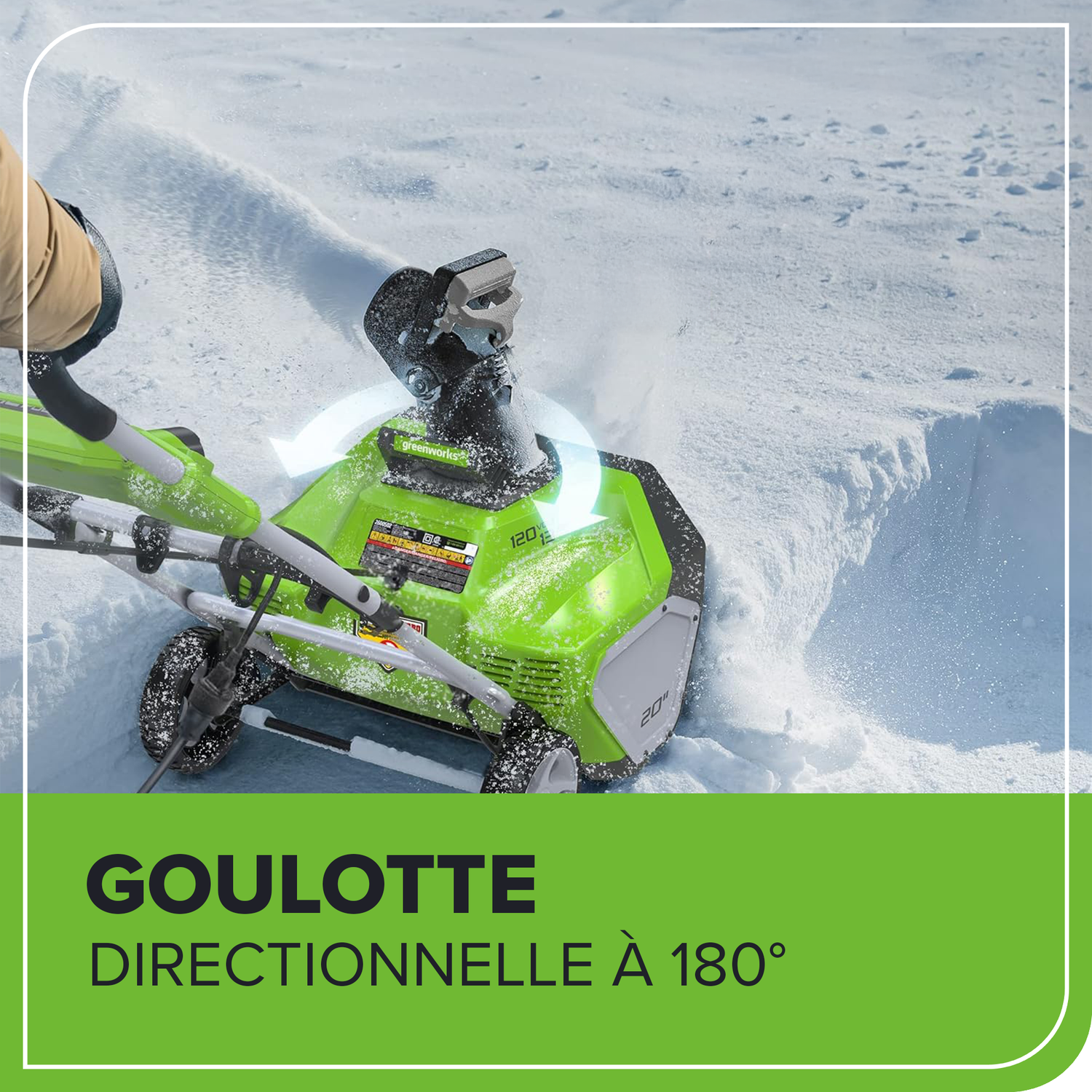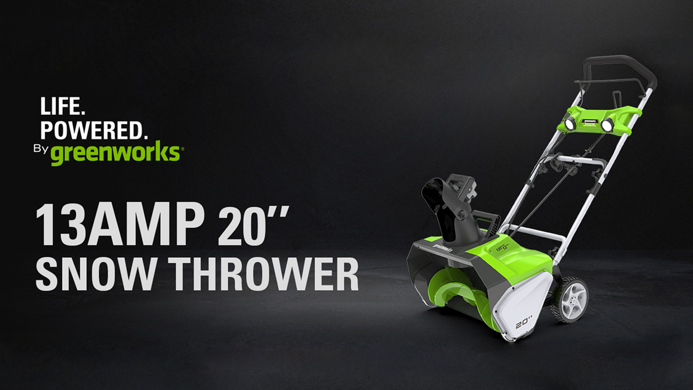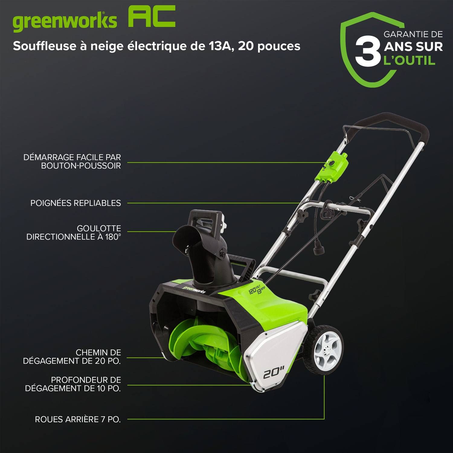 Bienvenue à La Vie. Propulsée. par Greenworks. La souffleuse à neige électrique 13A est la souffleuse à neige sans essence idéale pour les entrées de petite et moyenne taille. Dotée d'un chemin de dégagement de 20 po., d'une profondeur de dégagement de 10 po., d'une goulotte directionnelle à 180°, d'une manivelle facile à manœuvrer pour le contrôle directionnel et d'un simple démarrage électrique, cette souffleuse à neige de 13 A vous facilitera la vie. Greenworks propose une sélection polyvalente de souffleuses à neige électriques fiables, ainsi qu'une gamme complète d'outils de pelouse et de jardin électriques. Rendre la vie plus facile avec Greenworks et laissez le gaz, les dégâts, les fumées et les tracas derrière vous. Bénéficiant d'une garantie de 3 ans, cet appareil est conçu pour résister à l'épreuve du temps.
