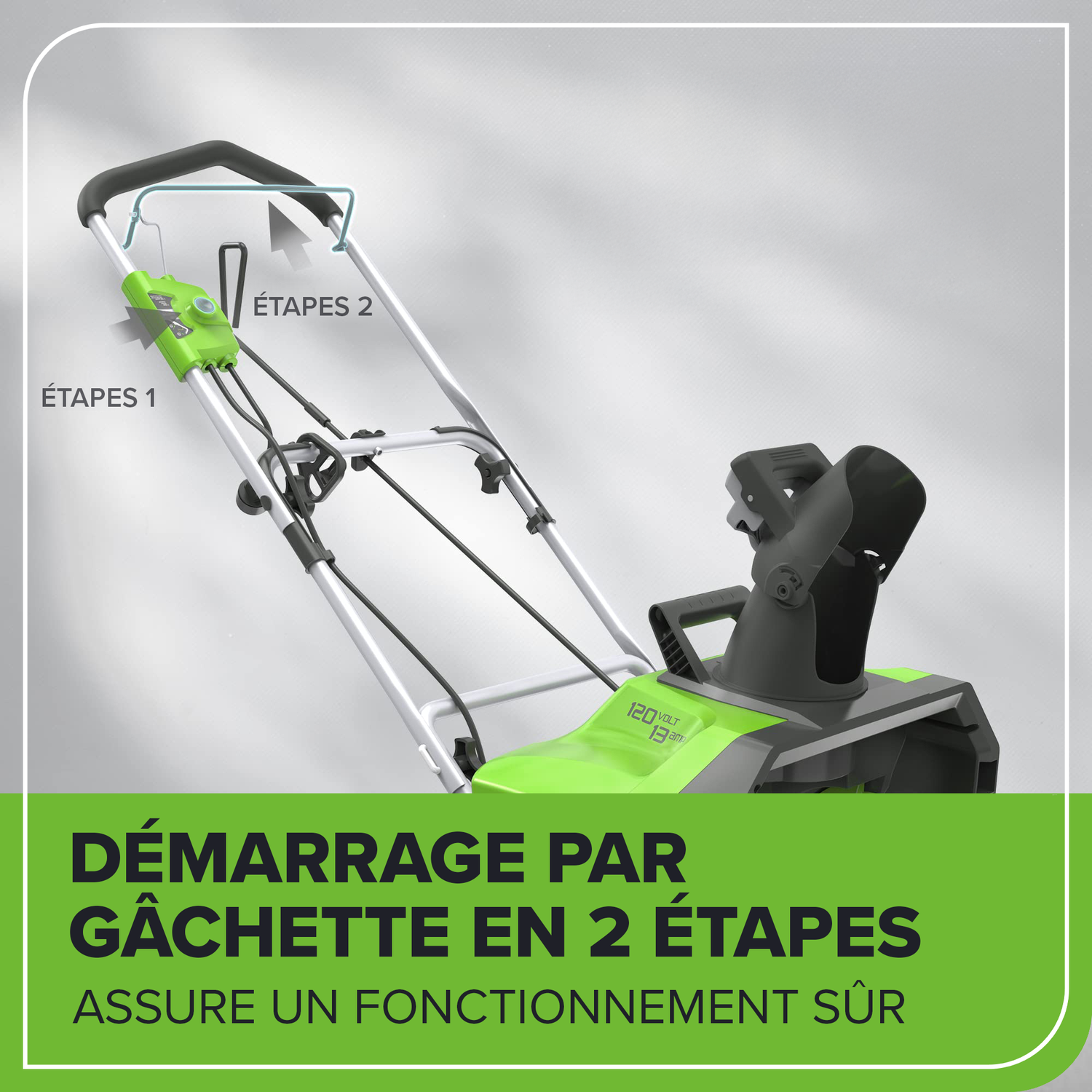 Bienvenue à La Vie. Propulsée. par Greenworks. La souffleuse à neige électrique 13A est la souffleuse à neige sans essence idéale pour les entrées de petite et moyenne taille. Dotée d'un chemin de dégagement de 20 po., d'une profondeur de dégagement de 10 po., d'une goulotte directionnelle à 180°, d'une manivelle facile à manœuvrer pour le contrôle directionnel et d'un simple démarrage électrique, cette souffleuse à neige de 13 A vous facilitera la vie. Greenworks propose une sélection polyvalente de souffleuses à neige électriques fiables, ainsi qu'une gamme complète d'outils de pelouse et de jardin électriques. Rendre la vie plus facile avec Greenworks et laissez le gaz, les dégâts, les fumées et les tracas derrière vous. Bénéficiant d'une garantie de 3 ans, cet appareil est conçu pour résister à l'épreuve du temps.