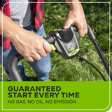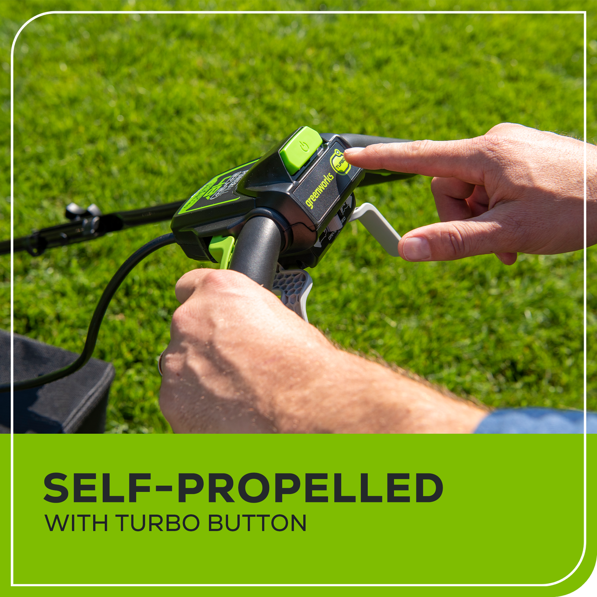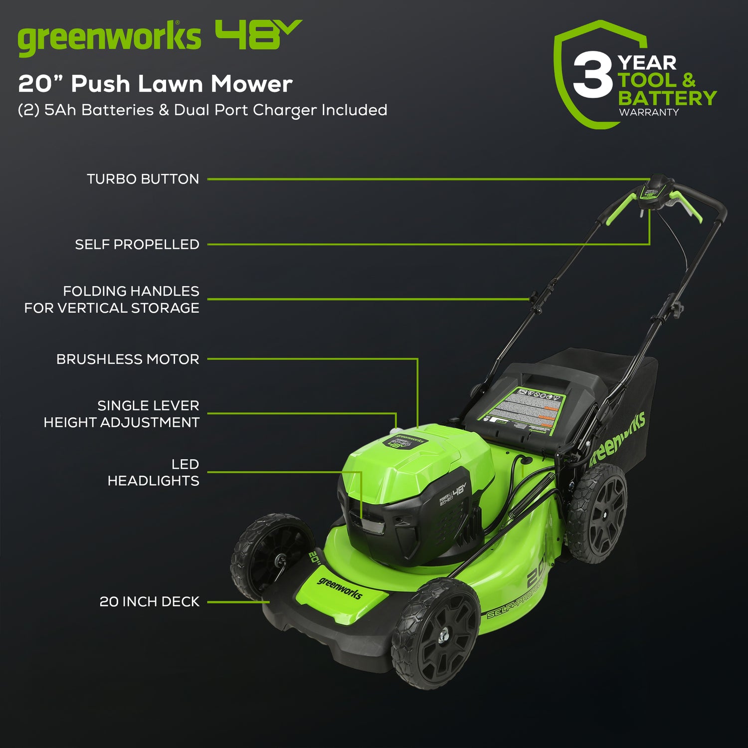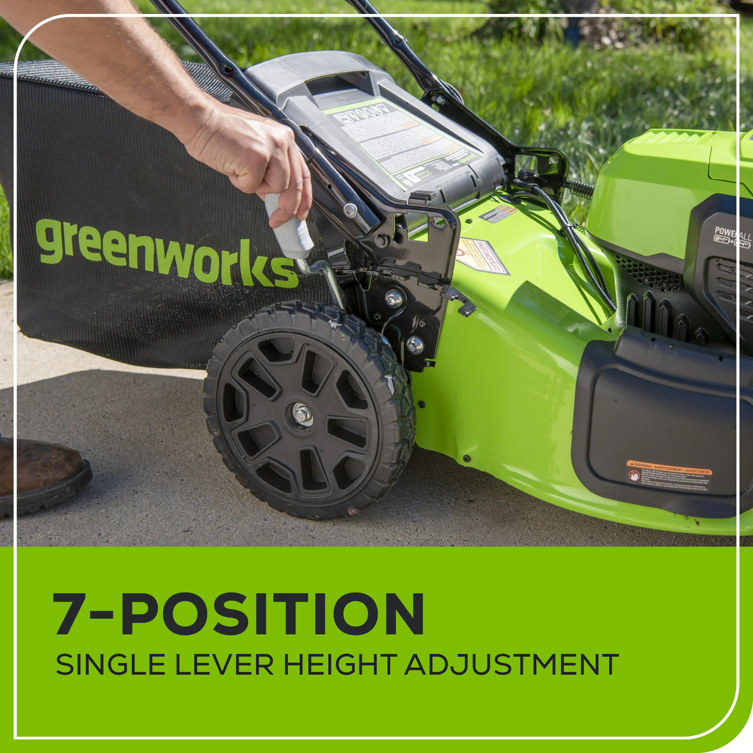 Bienvenue à La Vie. Propulsée. Par Greenworks. La plateforme lithium-ion Greenworks 24 V POWERALL™ alimente plus de 125 produits 24 V intérieurs et extérieurs, notamment des tondeuses, des souffleurs, des coupe-herbes, des scies à chaîne, des outils électroportatifs et bien plus encore ! Nos batteries 24 V fournissent 20 % de puissance en plus et 35 % d'autonomie en plus, et offrent une puissance sans décoloration et sans perte de mémoire après la charge. Donnez un coup de pouce au trottoir et passez au vert sans fumées, sans mélange, sans entretien et sans cordons de traction. Laissez Greenworks vous aider à simplifier les travaux de jardinage. Gardez votre pelouse incroyable avec la tondeuse automotrice sans balais Greenworks 2 x 24 V (48 V) 20 pouces (2) batteries USB 5 Ah et chargeur double port 4 A. Cette tondeuse à gazon sans fil fonctionnant sur batterie est dotée d'un carter en acier, de 7 hauteurs de coupe et de la technologie innovante SmartCut, démarrage par bouton-poussoir et poignées rabattables pour un rangement compact lorsque vous recherchez des outils et des équipements électriques d'extérieur, nous savons que vous pensez à la qualité. C'est pourquoi Greenworks soutient nos outils 24 V avec une garantie limitée de 3 ans sur les outils et la batterie.
