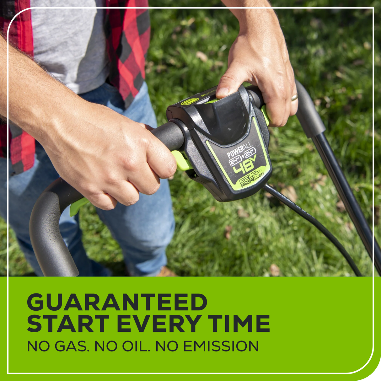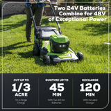 - NE JAMAIS ARRÊTER DE TONDRE Deux batteries Greenworks 24 V POWERALL se combinent pour 48 V d'une puissance exceptionnelle, meilleure que l'essence sans quitter la plate-forme de batterie 24 V . Jusqu'à 50 minutes d'autonomie avec les batteries incluses et un temps de charge de 75 minutes par batterie. De plus, le port USB intégré à la batterie charge tous les appareils électroniques portables, y compris les téléphones et les tablettes.