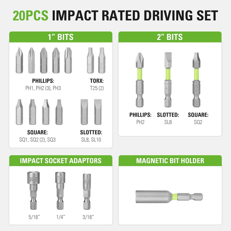 Ce jeu d'embouts comprend les tailles d'embouts les plus utilisés, nécessaires à un large éventail de tâches. Il est compatible avec la plupart des perceuses et visseuses du marché. Idéal pour la plupart des projets de bricolage, d’entretien domestique et de réparations. Cet ensemble comprend une pointe d'embout fraisée avec précision pour un meilleur ajustement avec les fixations couramment utilisées. Les embouts de 2 pouces comportent une zone de torsion qui absorbe le couple élevé des applications plus exigeantes et aide à préserver les pointes des embouts. Il offre également flexibilité et durabilité pour une durée de vie prolongée. Notre jeu comprend un porte-embout magnétique et deux adaptateurs de douilles à impact pour un changement rapide et facile entre les tailles, vous permettant de pivoter rapidement entre les projets. Compatible avec la plupart des perceuses, tournevis électriques et autres outils électriques de marque. Un jeu d'embouts complet et de haute qualité de 20 pièces offre une commodité tout-en-un aux utilisateurs qui souhaitent que des accessoires soient facilement disponibles pour les tâches quotidiennes. C'est une perceuse et un embout de tournevis indispensables dans votre garage domestique. L'ensemble d'embouts est livré avec un étui de rangement portable avec une disposition épurée pour un stockage sécurisé, un accès, une organisation et une portabilité faciles. La bande verte sur les embouts facilite leur recherche sur le chantier et dans votre boîte à outils.