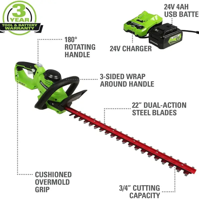 Taille-haie 24 V, 22 pouces, batterie 4,0 Ah et chargeur
