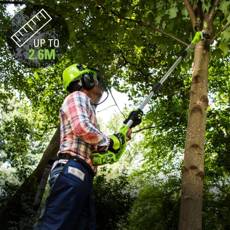 • SANS ENTRETIEN – La scie à perche et le taille-haie à perche ne nécessitent pratiquement aucun entretien, sans gaz, ni huile, ni émissions. Il démarre instantanément, est silencieux et fournit la puissance dont vous avez besoin.