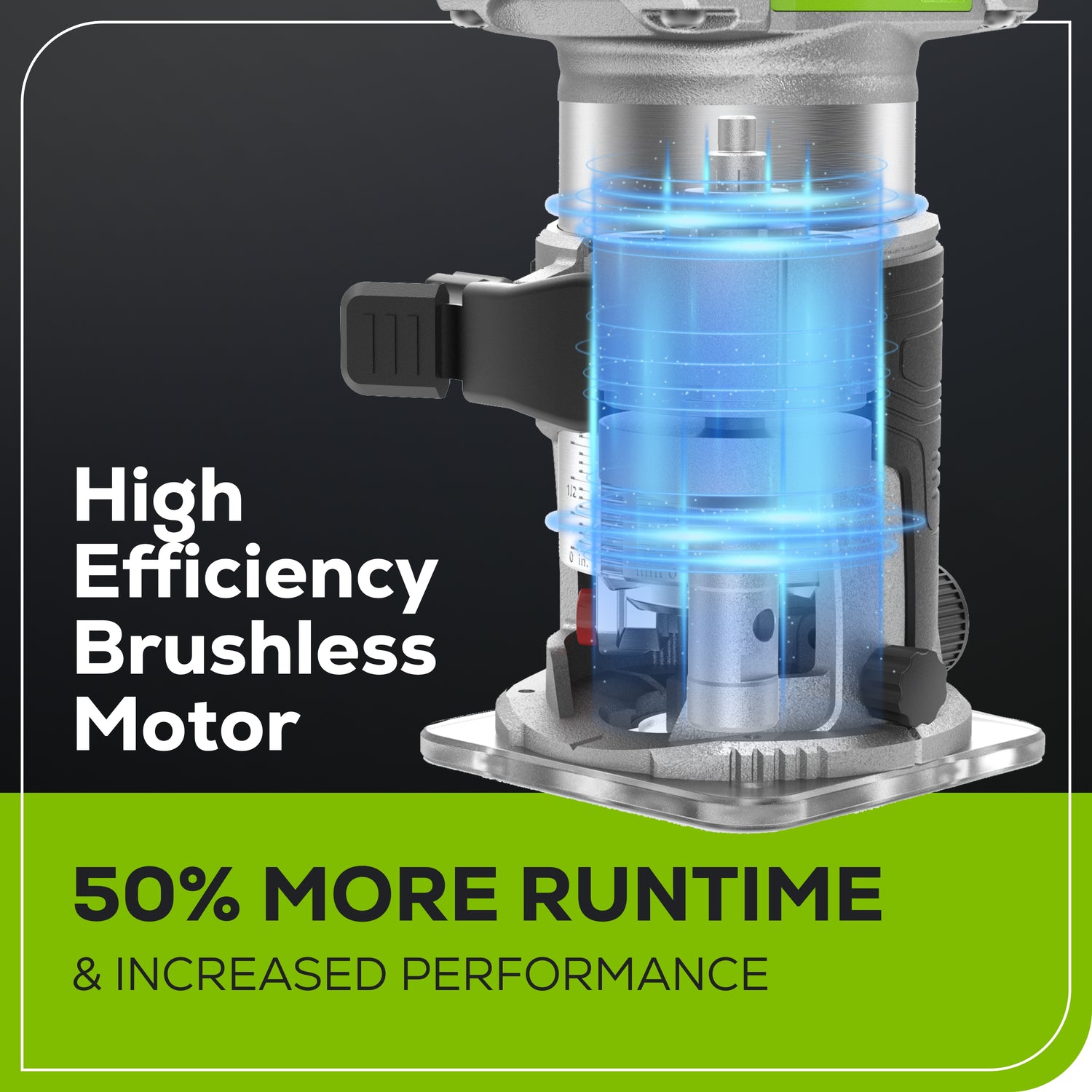 Performances sans balais : plus de puissance, des durées de fonctionnement plus longues, un fonctionnement plus silencieux et une durée de vie beaucoup plus longue que les outils à moteur brossé. Produisant une vitesse variable de 10 000 à 30 000 tr/min, ce routeur compact est suffisamment polyvalent pour effectuer la plupart des tâches de routeur de taille standard.