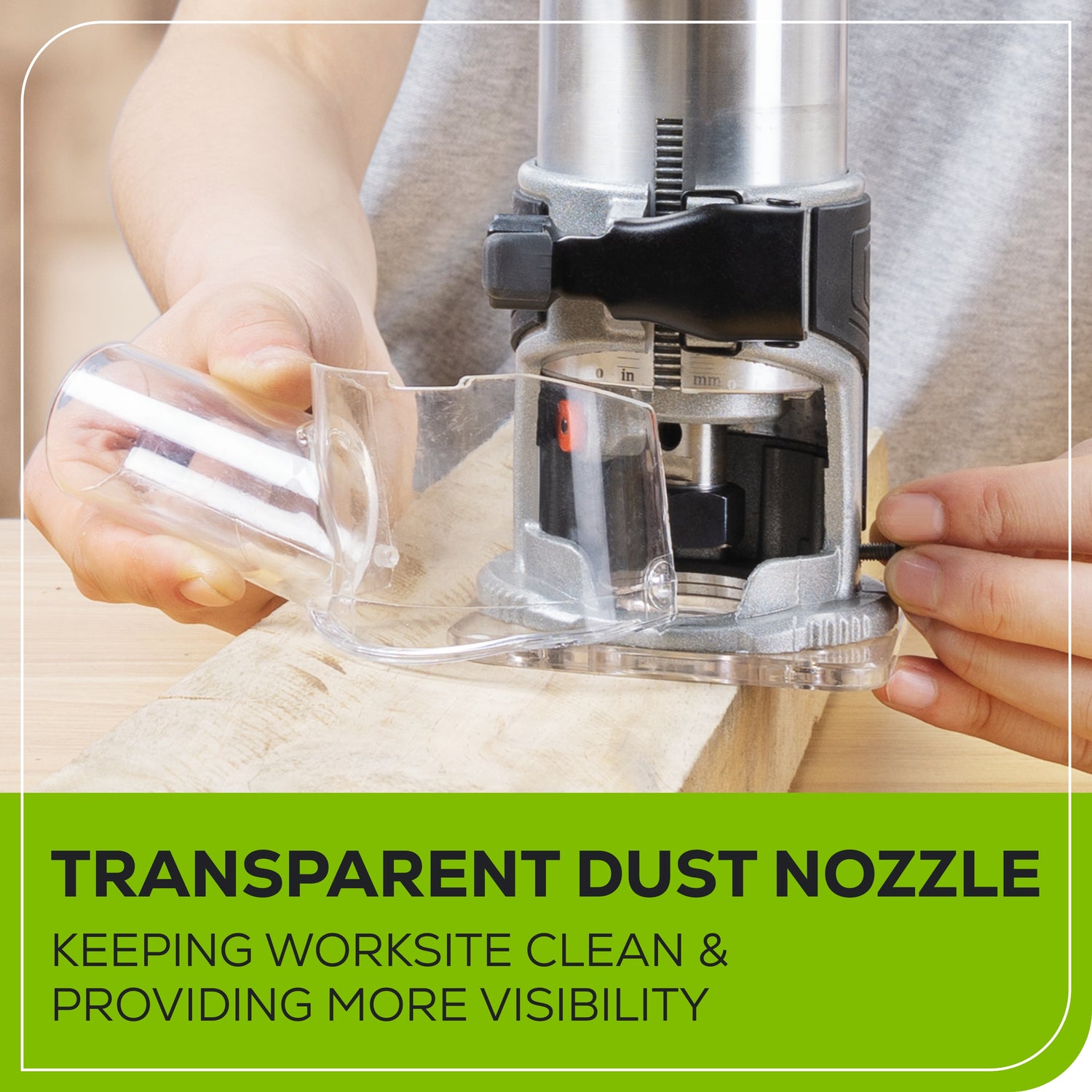Découper des mortaises de charnière, profiler des bords, tailler du placage, fraiser des incrustations et des rainures, percer des trous et bien plus encore ! 5 réglages de vitesse de 10 000 à 30 000 tr/min pour une coupe optimale et un réglage de la profondeur sans outil pour correspondre à l'application et les lumières à DEL intégrées éclairent les espaces de travail sombres. Le guide de bord réglable pour un positionnement précis des incrustations, des rainures et bien plus encore. Comprend également un pare-poussière transparent avec fixation pour tuyau d'aspiration pour aider à réduire les dégâts au minimum.