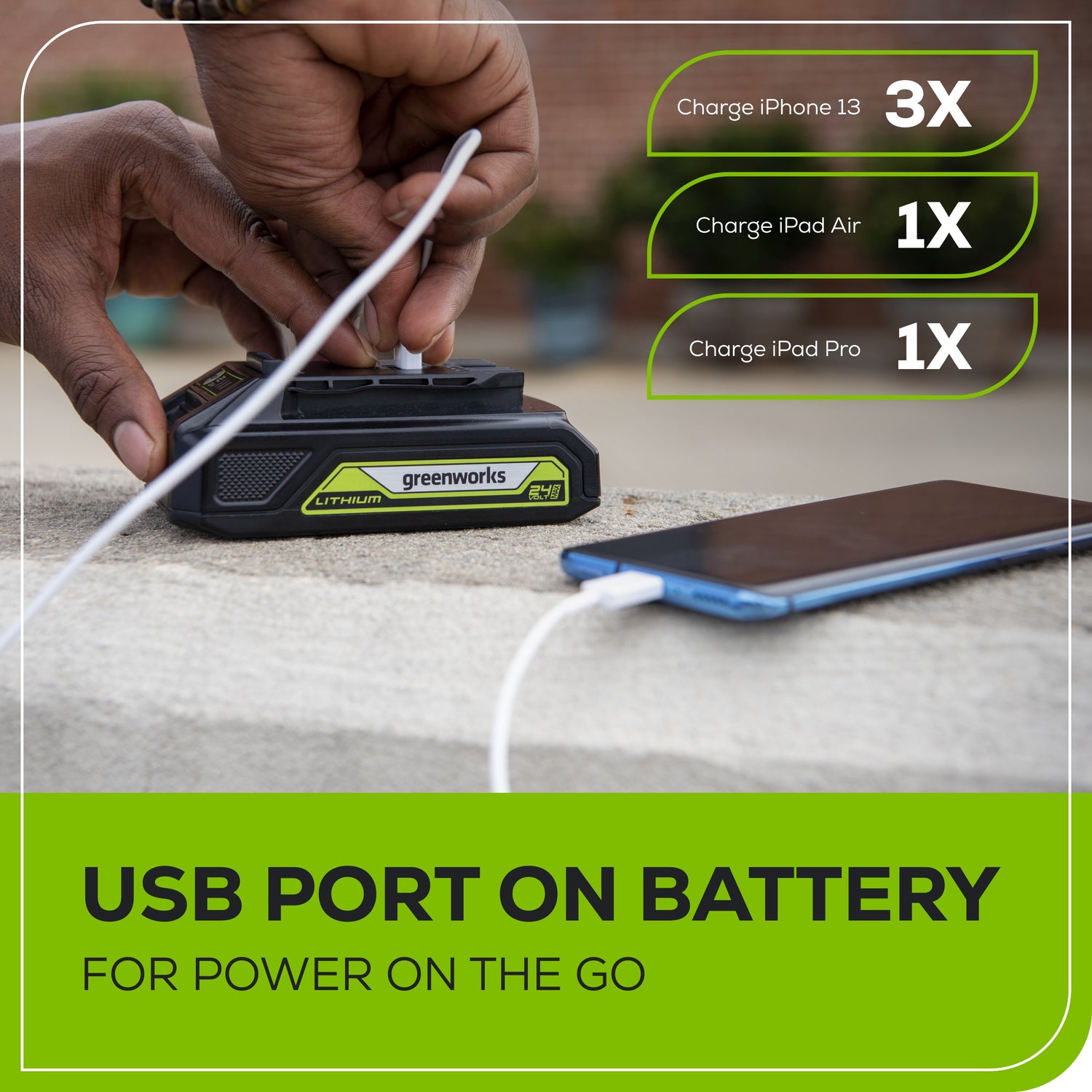 La batterie lithium-ion 24 V de Greenworks est dotée d'un indicateur DEL qui affiche la puissance restante. Ces batteries hautes performances se chargent rapidement et offrent une charge fiable sans perte de mémoire ou de puissance. Une batterie de 2,0 Ah sera complètement chargée en 90 minutes et à 80 % en seulement 50 minutes.