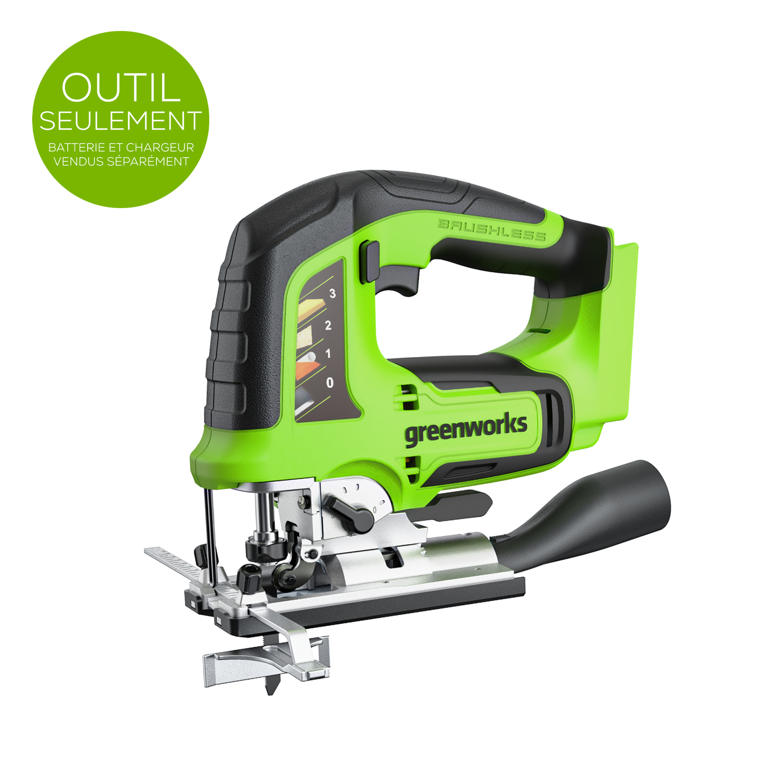 La scie sauteuse sans balais Greenworks est dotée d'une course de lame de 1 po. qui permet à l'utilisateur de couper des matériaux plus épais en plus d'une gâchette à vitesse variable pour un contrôle maximal, environ 3 000 coups par minute. Conçue avec un biseau sans outil qui s'ajuste de 0° à 45°. à droite ou à gauche pour des réglages de biseau fluides et faciles, ainsi que 3 réglages orbitaux : moins vous utilisez d'action orbitale, plus votre coupe est précise ; plus vous utilisez d'action orbitale, plus elle coupera rapidement. pince de lame gratuite pour un changement de lame rapide et facile et lumière à DEL intégrée pratique pour travailler dans des espaces mal éclairés. La plate-forme Greenworks 24 V POWERALL™ est livrée avec un outil limité à 3 ans pour protéger votre investissement.