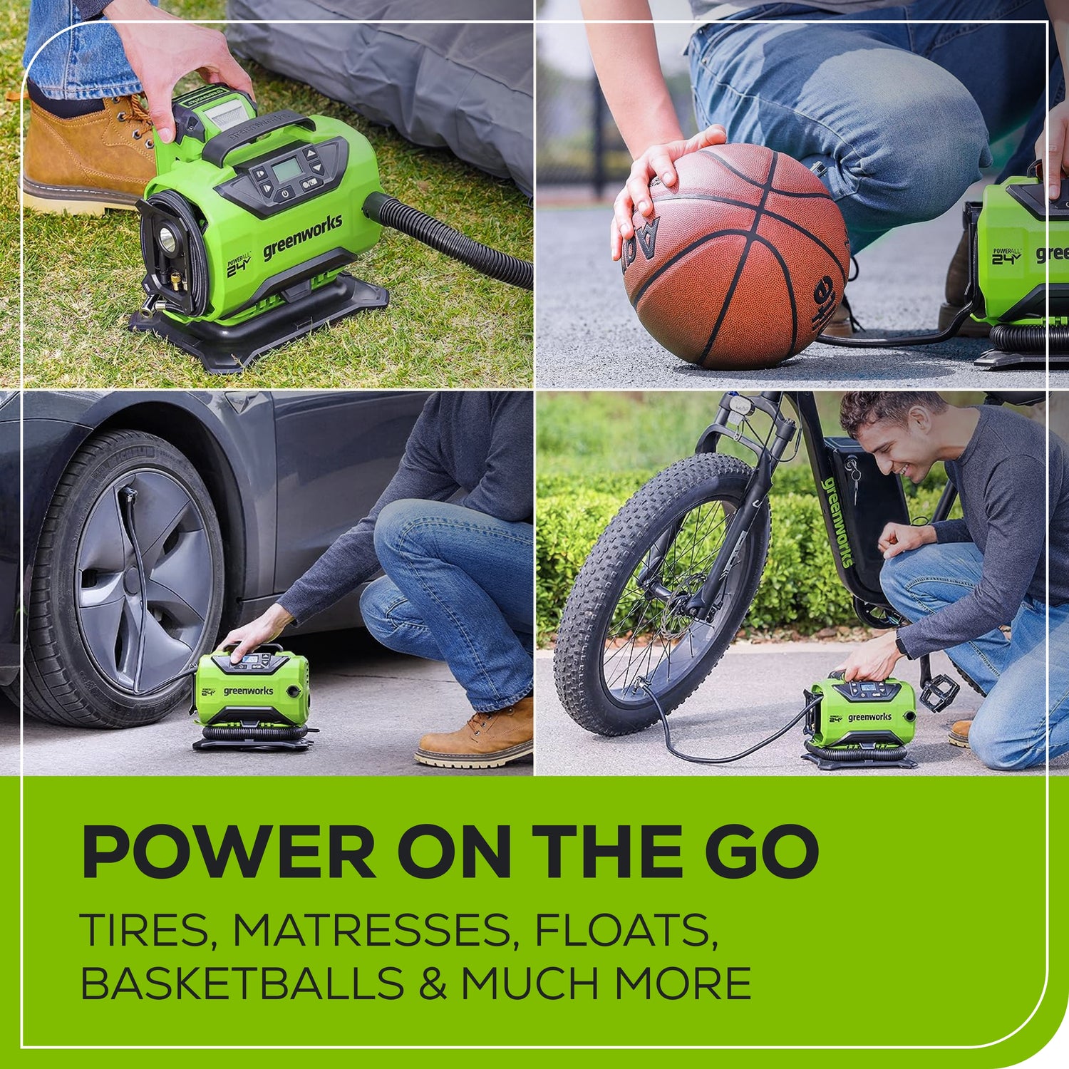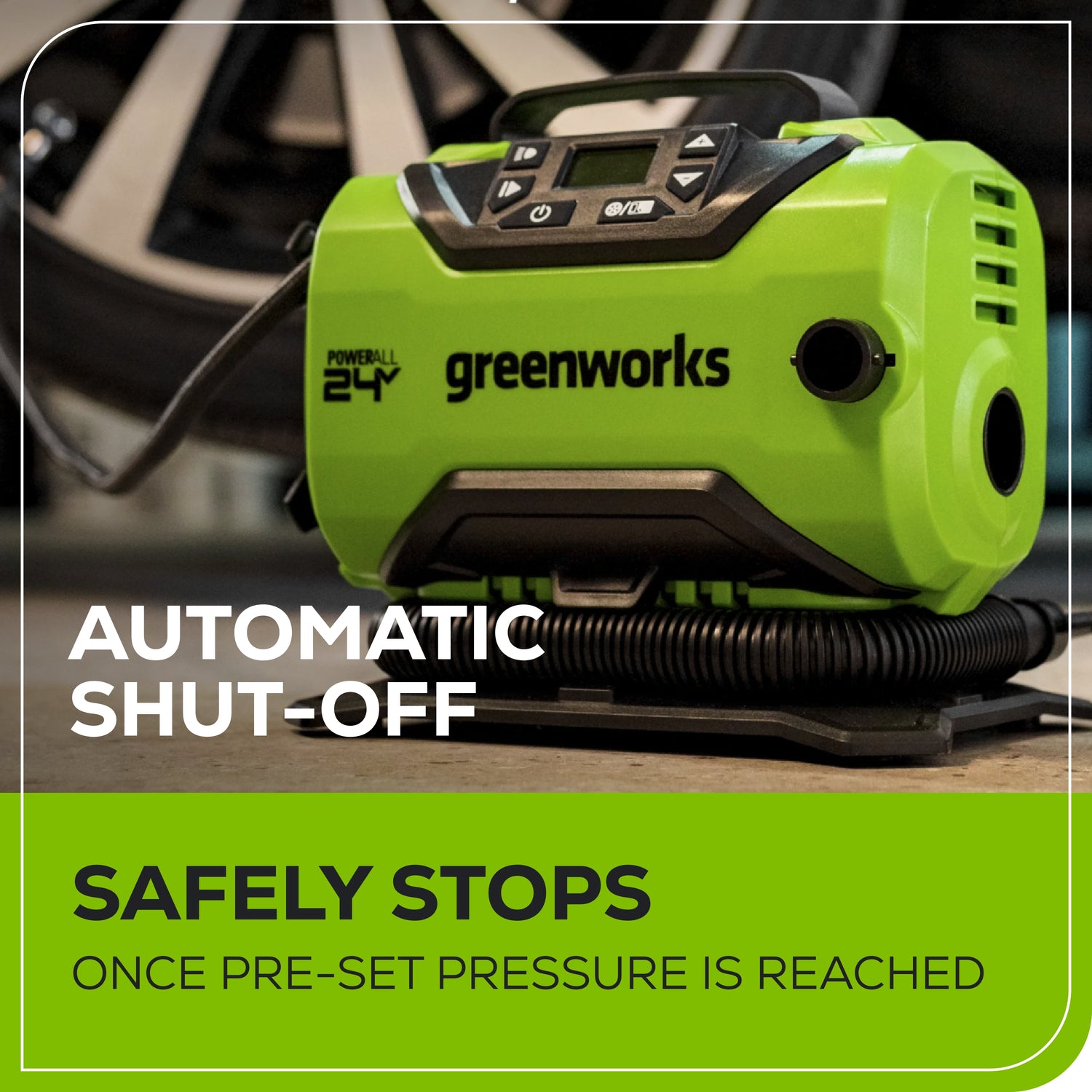 Parfait pour les voitures, motos, vélos, camping-cars, matelas pneumatiques, bateaux gonflables, équipements sportifs et autres objets gonflables. Ce gonfleur dispose de deux sources d'alimentation : une batterie rechargeable Greenworks de 24 volts (vendue séparément) ou une prise de courant de véhicule de 12 volts pour répondre à votre utilisation quotidienne. Pouvez-vous être utilisé avec ou sans fil. L'affichage numérique de la pression avec arrêt automatique vous n'avez donc pas à vous soucier d'un gonflage excessif. Réglez simplement le PSI (lb/po²) souhaité et l'appareil s'éteindra automatiquement. La pompe à air haute pression peut générer jusqu'à 160 psi pour remplir votre pneu en quelques minutes. La pompe à haut débit peut être utilisée pour gonfler rapidement les matelas pneumatiques et les flotteurs de piscine et les dégonfler rapidement pour un nettoyage rapide et facile grâce à la fonction de dégonflage. Le gonfleur dispose également d'une lumière DEL intégrée pour éclairer l'espace de travail.