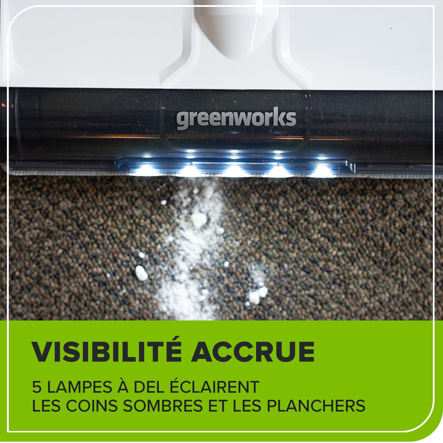 Bienvenue à la vie. Propulsée par Greenworks. L'aspirateur sans fil 24V sans balais vous permet de profiter de la liberté du nettoyage sans fil sans sacrifier la puissance d'aspiration. Conçu pour la commodité, il est compact, léger et facile à ranger, ce qui rend l'aspiration moins pénible. Grâce à un moteur sans balais efficace, vous bénéficiez d'une aspiration plus puissante, d'un fonctionnement plus silencieux et d'une durée de vie plus longue du moteur. Trois modes de puissance réglables permettent de personnaliser les performances et de contrôler la consommation d'énergie pour une plus grande autonomie. L'écran tactile à DEL convivial affiche le mode d'alimentation, les messages d'erreur et l'autonomie restante de la batterie pour plus de commodité. De plus, la batterie lithium-ion 24 V incluse se transforme en banque d'alimentation portable avec un port Type-C, vous permettant de charger des appareils tels que des téléphones et des tablettes lors de vos déplacements.