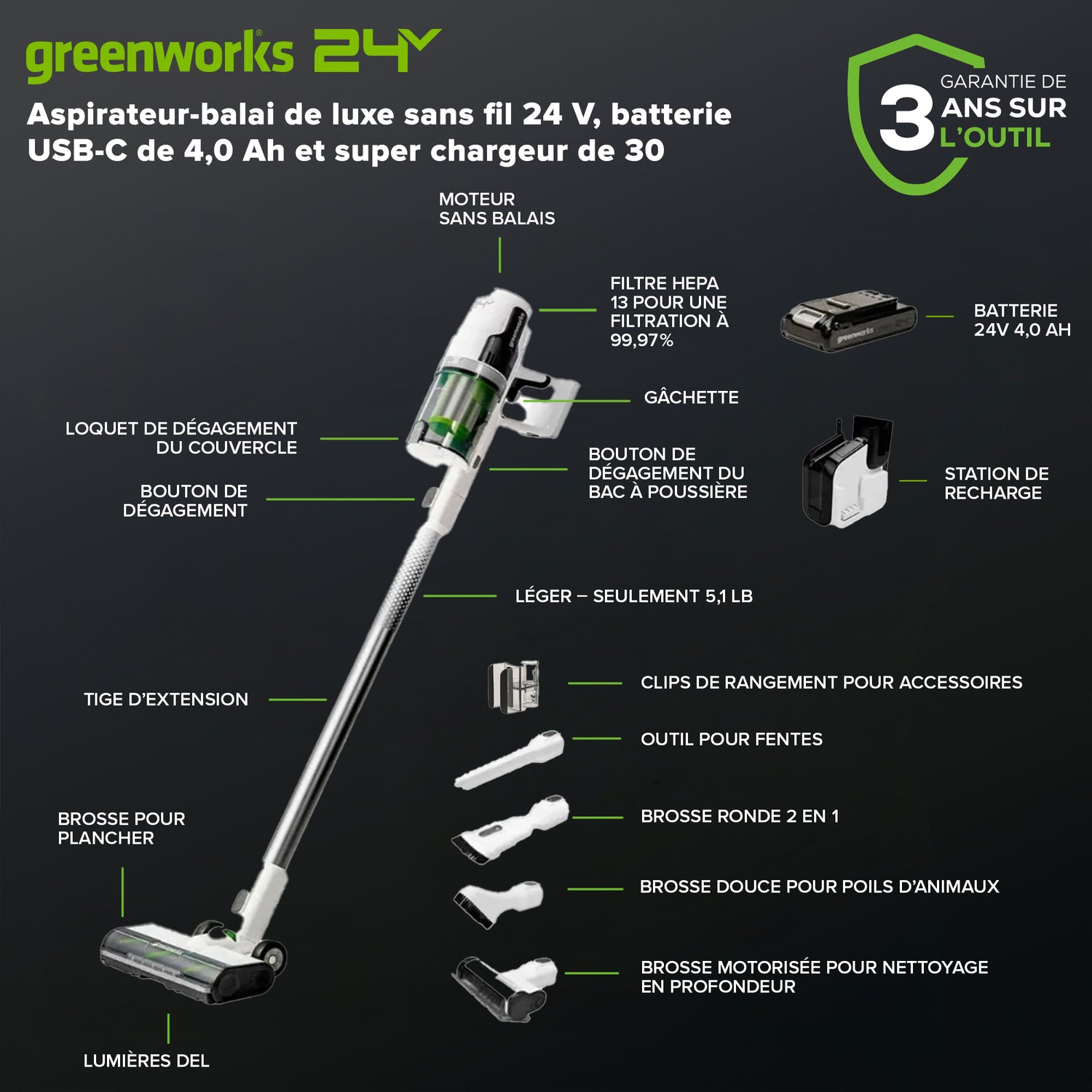 Aspirateur-balai de luxe à batterie 24 V, batterie USB-C de 4,0 Ah et superchargeur de 30 minutes