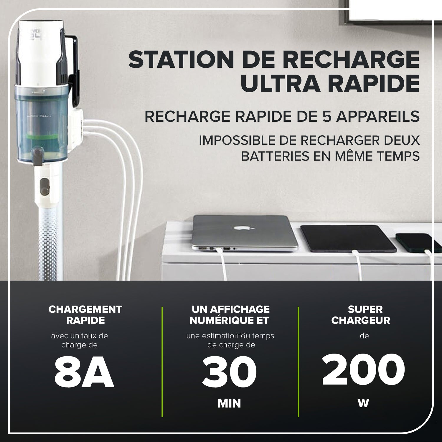 Superchargeur de 200 W : Chargement rapide avec un taux de charge de 8A, un affichage numérique et une estimation du temps de charge de 30 minutes. Comprend des ports pour le socle de l'aspirateur, la batterie de rechange, (2) périphériques USB-C et (1) périphérique USB-A.
