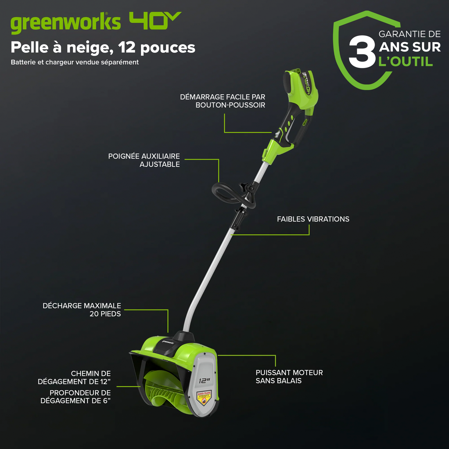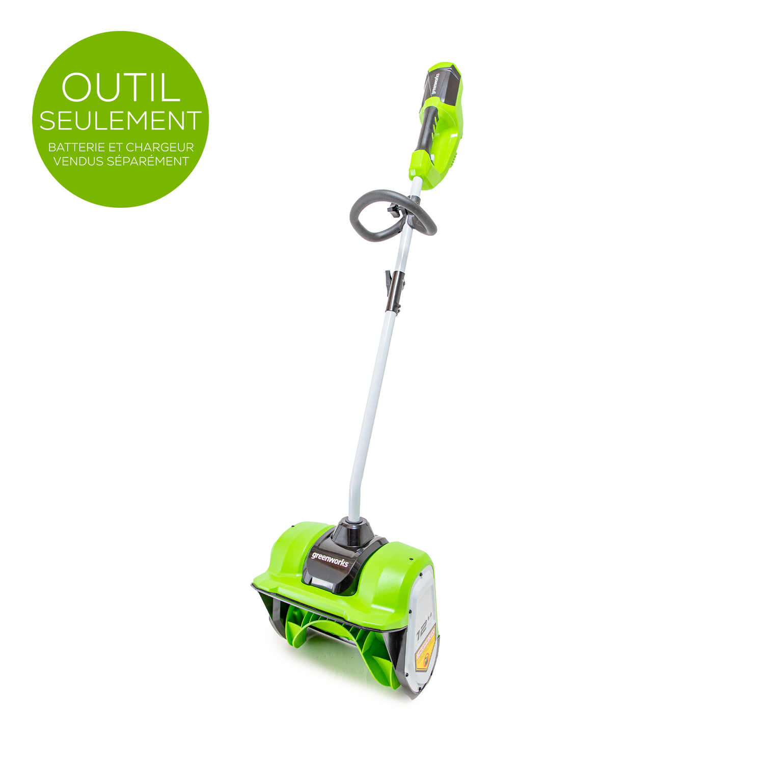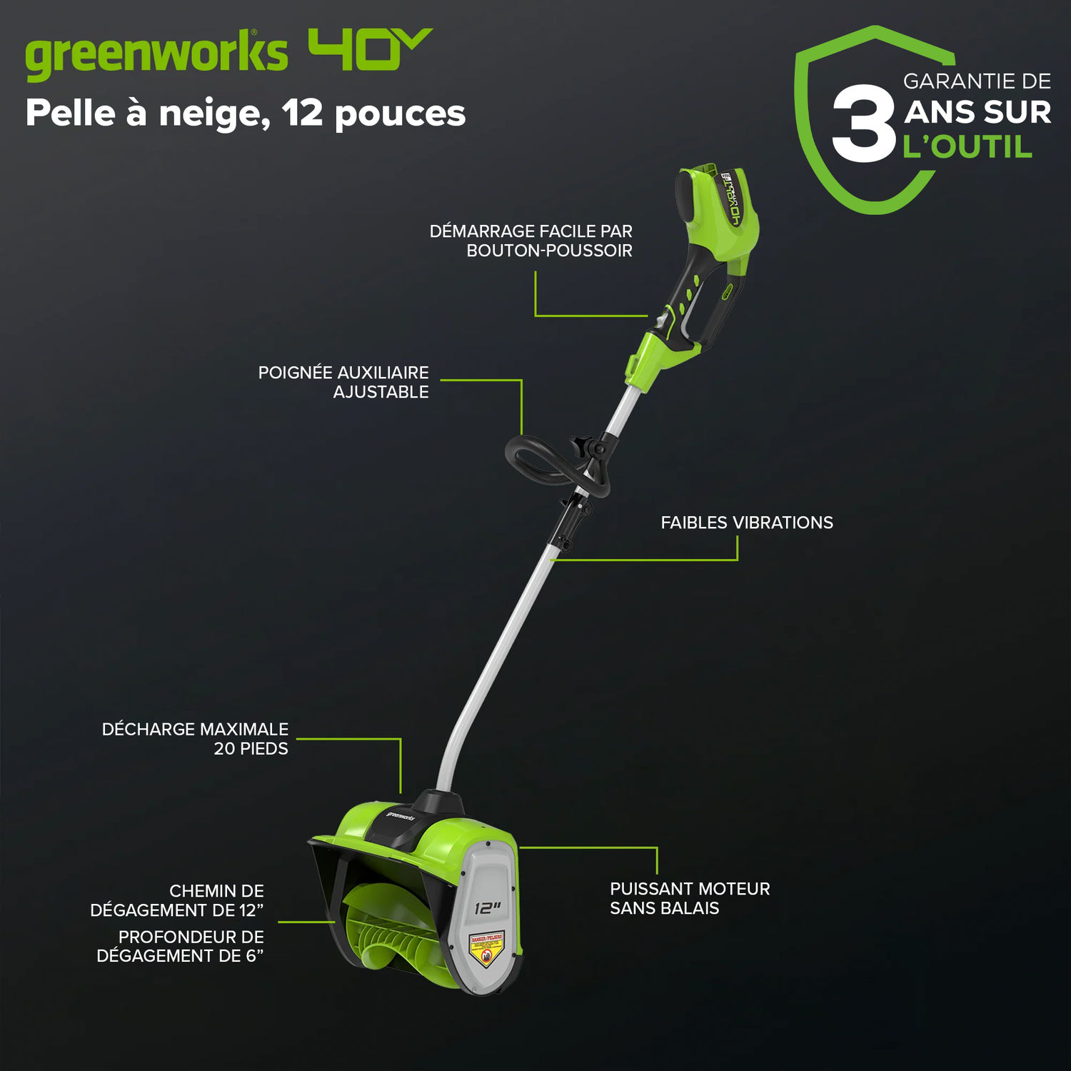 Bienvenue à La Vie. Propulsée. Par Greenworks. Facilitez le dégagement des trottoirs et des entrées cet hiver avec la pelle à neige sans balais Greenworks 40 V 12 po. Construite avec un moteur sans balais à haut rendement de 1,1 kW offrant des vitesses de turbine allant jusqu'à 1 800 tr/min, cette pelle à neige impressionnera à coup sûr. Son fonctionnement silencieux la rend pratique pour à utiliser tôt le matin ou tard le soir. Alimenté par une batterie lithium-ion de 40 V, il présente une largeur de dégagement de 12 po. et une profondeur de dégagement de 4 po. Dites adieu au gaz cet hiver et bonjour à Greenworks. Cette pelle à neige est compatible avec le système complet d'outils et de batteries Greenworks 40V (vendu au Canada). Commencez avec une trousse à outils, puis ajoutez un équipement contenant uniquement des outils. Bénéficiant d'une garantie de 3 ans, cette pelle à neige est conçue pour durer des années.