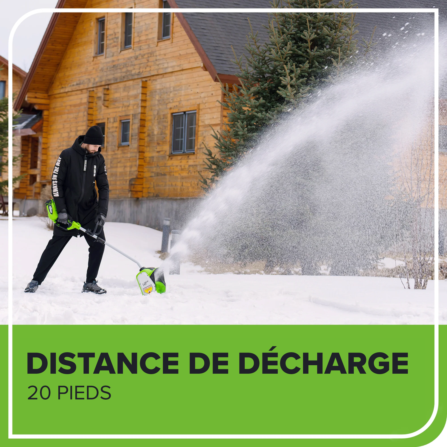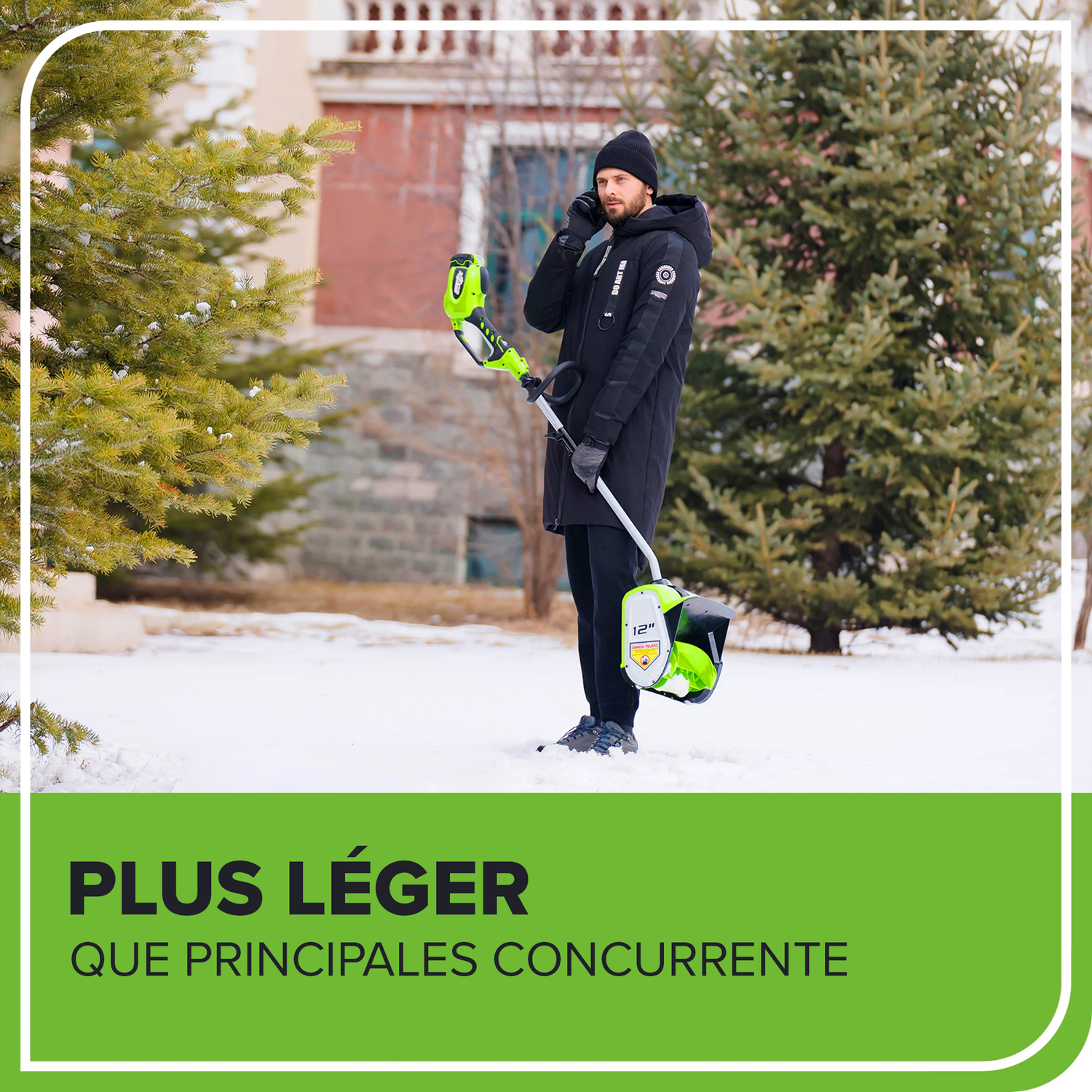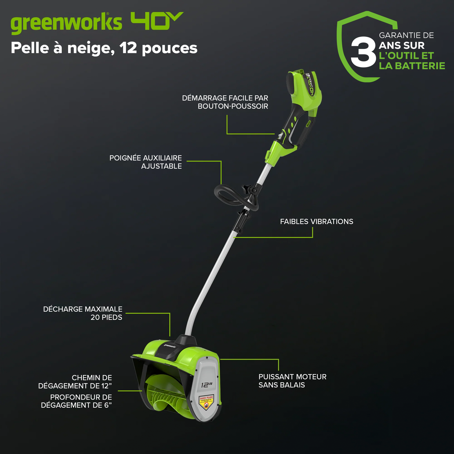 Bienvenue à La Vie. Propulsée. Par Greenworks. Facilitez le dégagement des trottoirs et des entrées cet hiver avec la pelle à neige sans balais Greenworks 40 V 12 po. Construite avec un moteur sans balais à haut rendement de 1,1 kW offrant des vitesses de turbine allant jusqu'à 1 800 tr/min, cette pelle à neige impressionnera à coup sûr. Son fonctionnement silencieux la rend pratique pour à utiliser tôt le matin ou tard le soir. Alimenté par une batterie lithium-ion de 40 V, il présente une largeur de dégagement de 12 po. et une profondeur de dégagement de 4 po. Dites adieu au gaz cet hiver et bonjour à Greenworks. Cette pelle à neige est compatible avec le système complet d'outils et de batteries Greenworks 40V (vendu au Canada). Bénéficiant d'une garantie de 3 ans, cette pelle à neige est conçue pour durer des années.