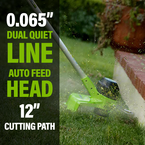 - ALIMENTATION AUTOMATIQUE Le chemin de coupe de 12 pouces permet d'effectuer le travail rapidement. Système d'alimentation automatique à double fil de 0,065 po. pour garantir que le fil reste viable pour la coupe. Arrêtez et démarrez simplement votre tondeuse pour augmenter la longueur du fil.