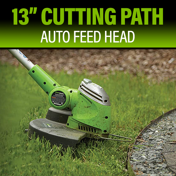 - ALIMENTATION AUTOMATIQUE Le chemin de coupe de 13 pouces permet d'effectuer le travail rapidement. Système d'alimentation automatique de fil unique de 0,065 po. pour garantir que le fil reste viable pour la coupe. Arrêtez et démarrez simplement votre tondeuse pour augmenter la longueur du fil.