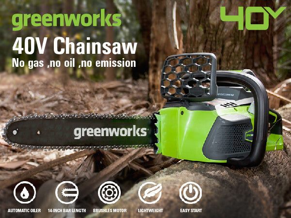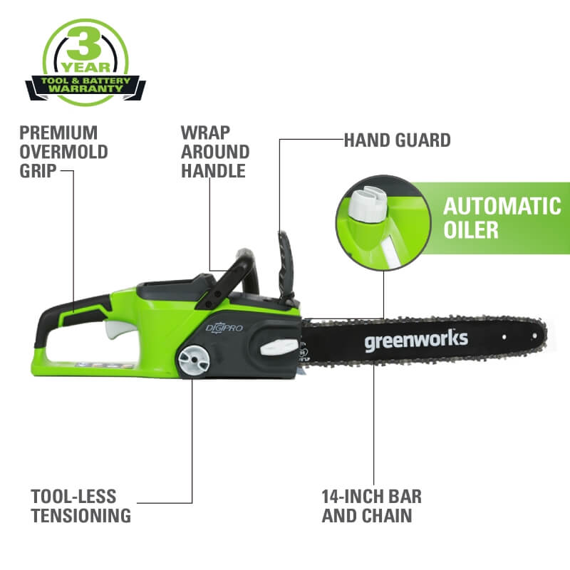 Le système Greenworks 40 V offre une large gamme d'outils faciles à utiliser pour le propriétaire et ceux qui veulent simplement plus de puissance. Cette scie à chaîne sans fil de 14 pouces est dotée d'un moteur sans balais à haute vitesse qui offre une puissance et des performances supérieures. Cet appareil est léger et dispose d'un graisseur automatique avec fenêtre de visualisation d'huile et tension d'accès latéral. Le guide-chaîne et la chaîne de 14 pouces conviennent aux applications moyennes à lourdes.