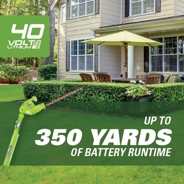 Les outils électriques d'extérieur sans fil sont idéaux pour les propriétaires comme vous qui simplifient et se concentrent sur ce qui est essentiel pour tirer le meilleur parti de la vie. La famille d'outils Greenworks 40 V est construite avec une construction de poids moyen et des moteurs à haut rendement. La plateforme lithium-ion Greenworks 40 V alimente plus de 40 produits d'extérieur, notamment des tondeuses, des souffleurs, des coupe-herbes, des scies à chaîne, des taille-haies et bien plus encore ! La batterie lithium-ion 40 V fournit la puissance dont vous avez besoin et offre une puissance sans décoloration et sans perte de mémoire après la charge. La plateforme Greenworks 40 V est livrée avec une garantie outil/batterie de 3 ans pour protéger votre investissement. De fabrication de haute qualité, ces produits sont faciles à démarrer et plus légers que les produits à gaz auxquels vous êtes habitué, ce qui rend votre journée de travail dans le jardin beaucoup plus facile. Parfaits pour les terrains allant jusqu'à ⅓ d'acre, les outils Greenworks 40 V sont légers, démarrent instantanément et ne nécessitent pratiquement aucun entretien – pas d'essence, pas d'huile, pas de gâchis – mais fournissent toujours une puissance semblable à celle du gaz.