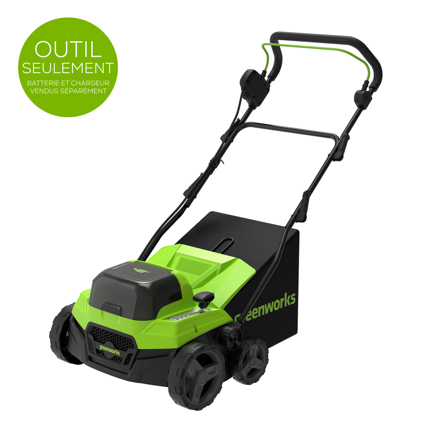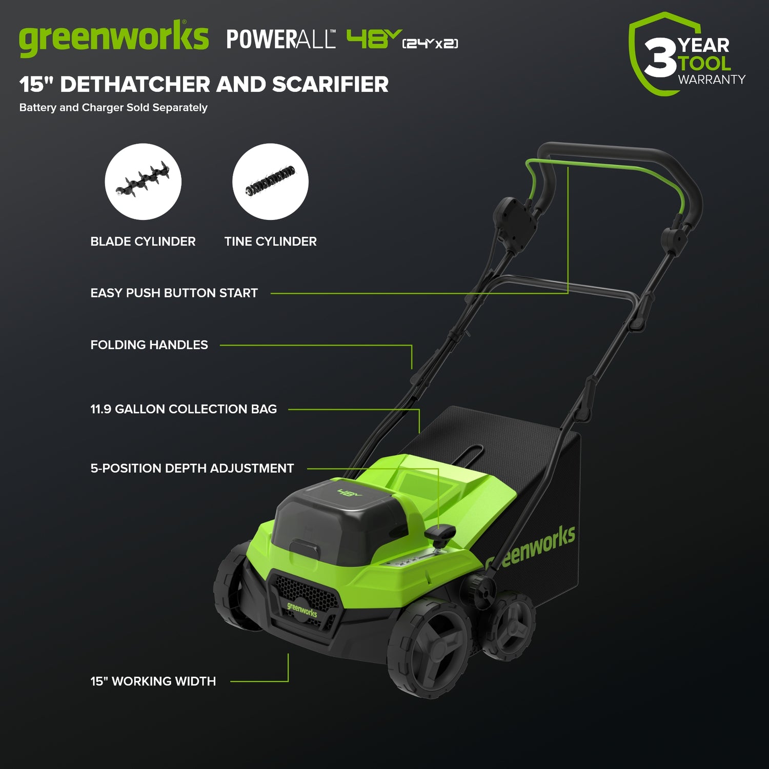Welcome to a Life. Powered. by Greenworks. Restore the health of your lawn with the Greenworks 48V (24V×2) 15" Brushless Dethatcher, designed to remove thatch buildup and promote stronger grass growth—all without gas, fumes, or maintenance. Powered by two Greenworks 24V batteries for 48V performance, this cordless dethatcher delivers consistent power with push-button start and quieter operation. Featuring both tine and blade cylinders, adjustable working depths, and a wide 15-inch working path, it allows you to customize lawn care for dethatching or scarifying tasks. With a foldable handle for compact storage and an included collection bag for easy cleanup, the Greenworks 48V Brushless Dethatcher provides efficient, convenient lawn rejuvenation. Tool only. Backed by a 3-Year Limited Tool Warranty for peace of mind.