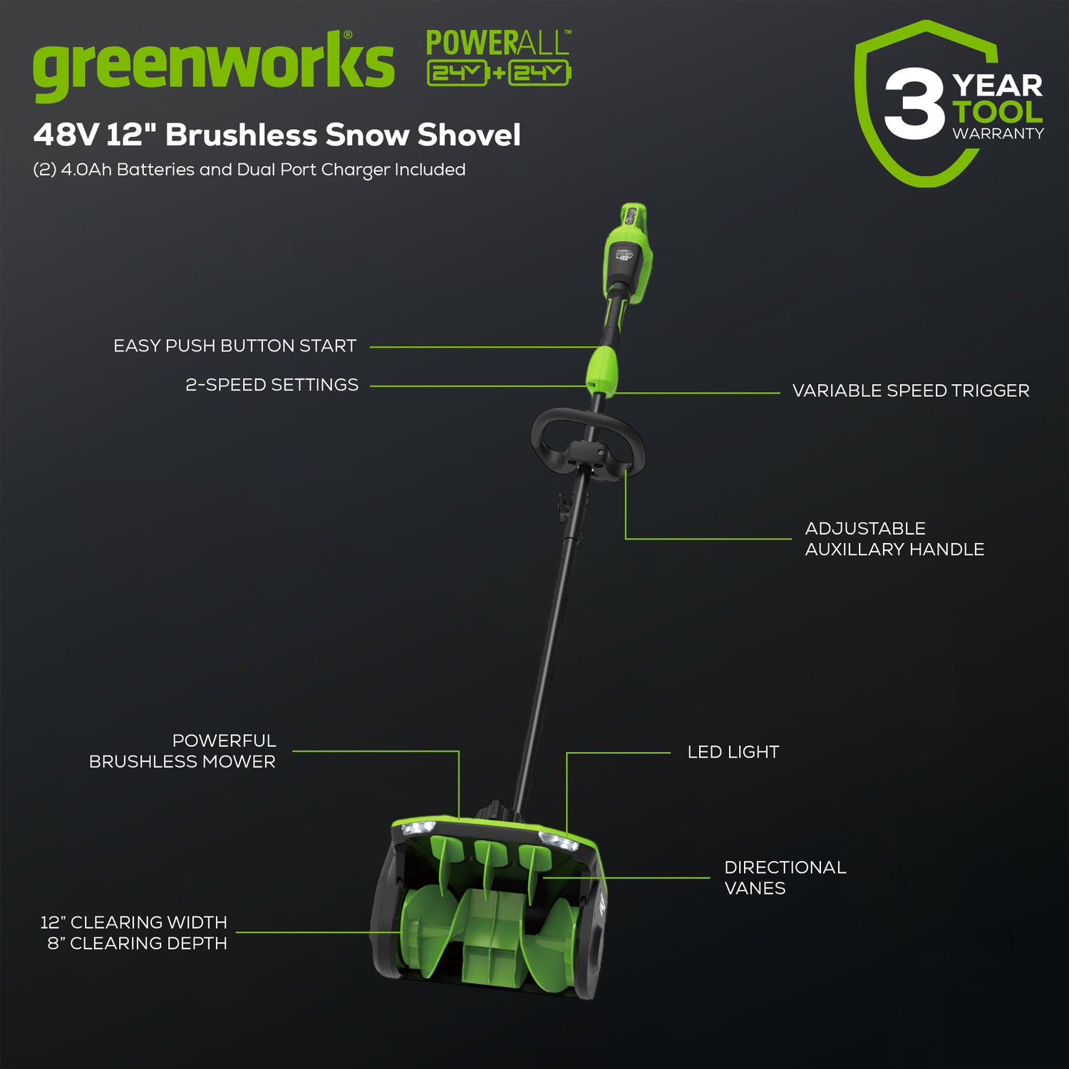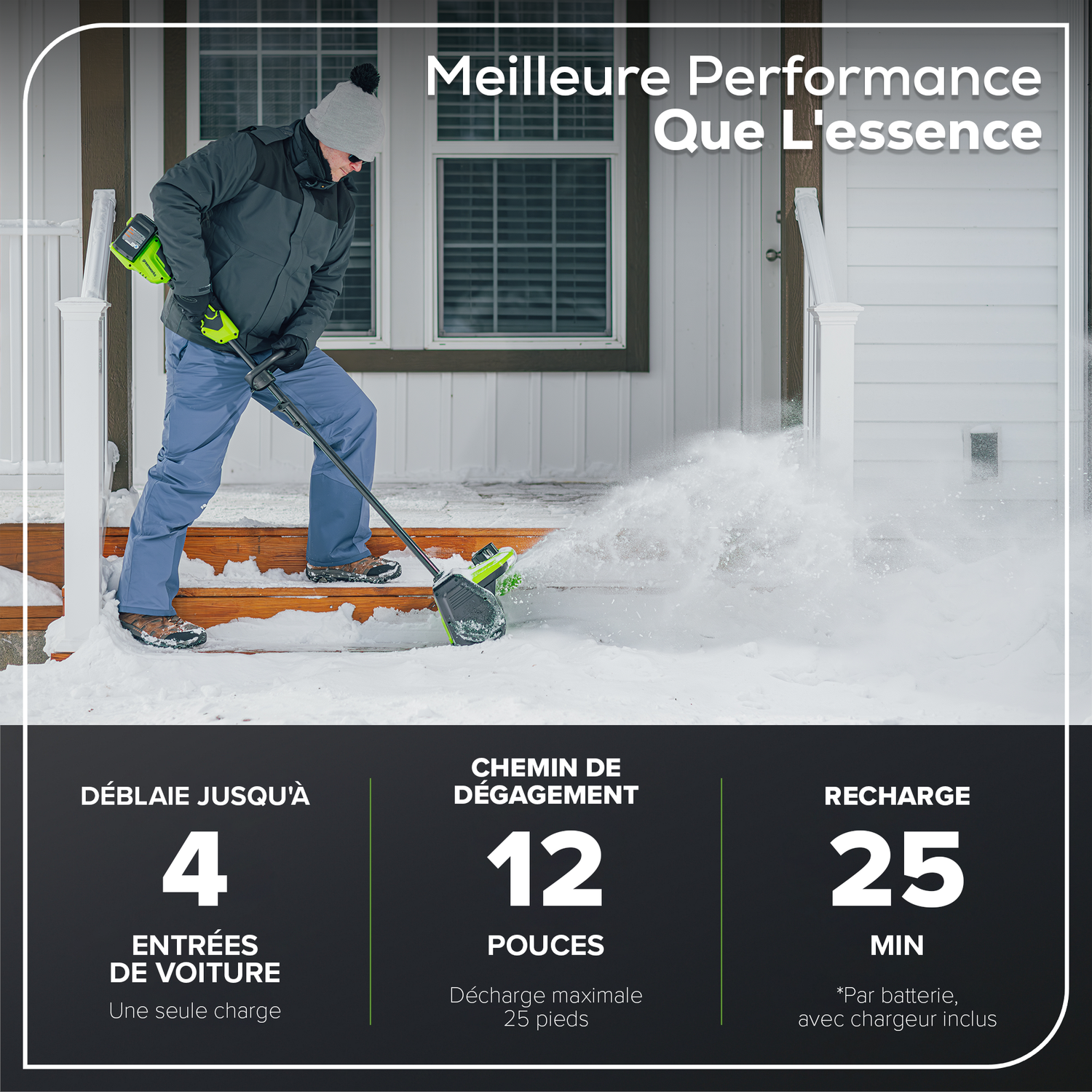 Bienvenue à La Vie. Propulsée. Par Greenworks. Révolutionnez votre hiver avec la pelle à neige sans balais (24 V x 2) (48 V) de 12 pouces. Dotée d'un moteur sans balais haute performance, de deux batteries de 4,0 Ah et d'un chargeur rapide à double port de 4 A, cette pelle à neige est conçue pour une performance et une praticité optimales. Éclairez votre chemin grâce à la lampe à DEL intégrée et dirigez la neige avec précision grâce à la commande directionnelle innovante. Bénéficiant d'une garantie de 3 ans et compatible avec plus de 200 outils Greenworks 24 V POWERALL, elle deviendra votre alliée indispensable pour affronter l'hiver. Déneigez en toute confiance et avec précision !