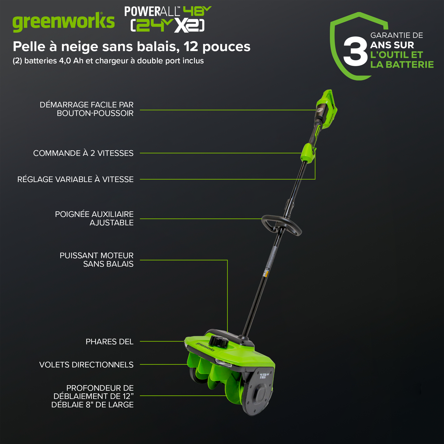 Bienvenue à La Vie. Propulsée. Par Greenworks. Révolutionnez votre hiver avec la pelle à neige sans balais (24 V x 2) (48 V) de 12 pouces. Dotée d'un moteur sans balais haute performance, de deux batteries de 4,0 Ah et d'un chargeur rapide à double port de 4 A, cette pelle à neige est conçue pour une performance et une praticité optimales. Éclairez votre chemin grâce à la lampe à DEL intégrée et dirigez la neige avec précision grâce à la commande directionnelle innovante. Bénéficiant d'une garantie de 3 ans et compatible avec plus de 125 outils Greenworks 24 V, elle deviendra votre alliée indispensable pour affronter l'hiver. Déneigez en toute confiance et avec précision !