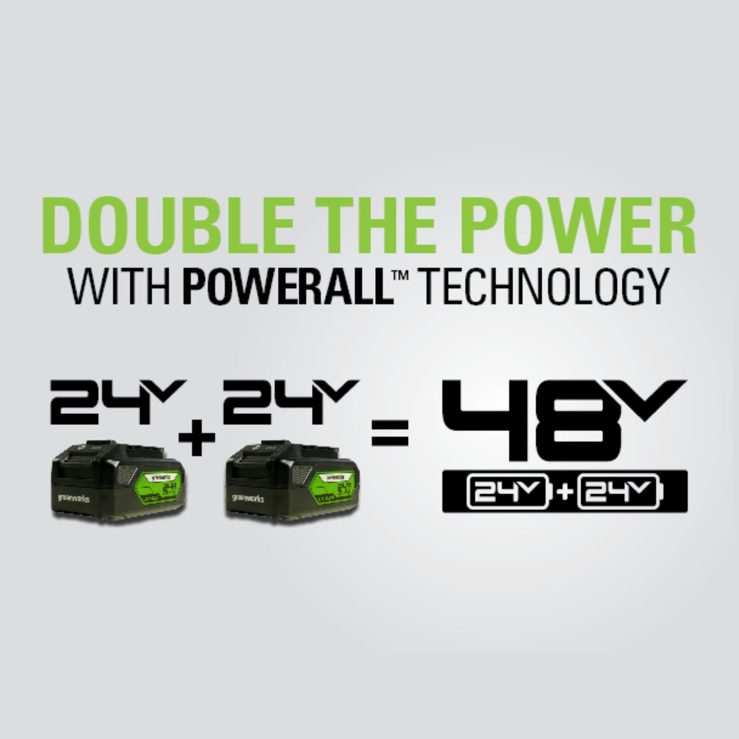 • [POWERALL™] : Deux batteries Greenworks POWERALL 24 V identiques se combinent pour fournir 48 volts de puissance exceptionnelle, supérieure à celle d’un moteur à essence, sans quitter la plateforme de batteries 24 V. Déneigez une allée pouvant accueillir jusqu’à quatre voitures avec une seule charge. Rechargez vos batteries rapidement en 120 minutes maximum.