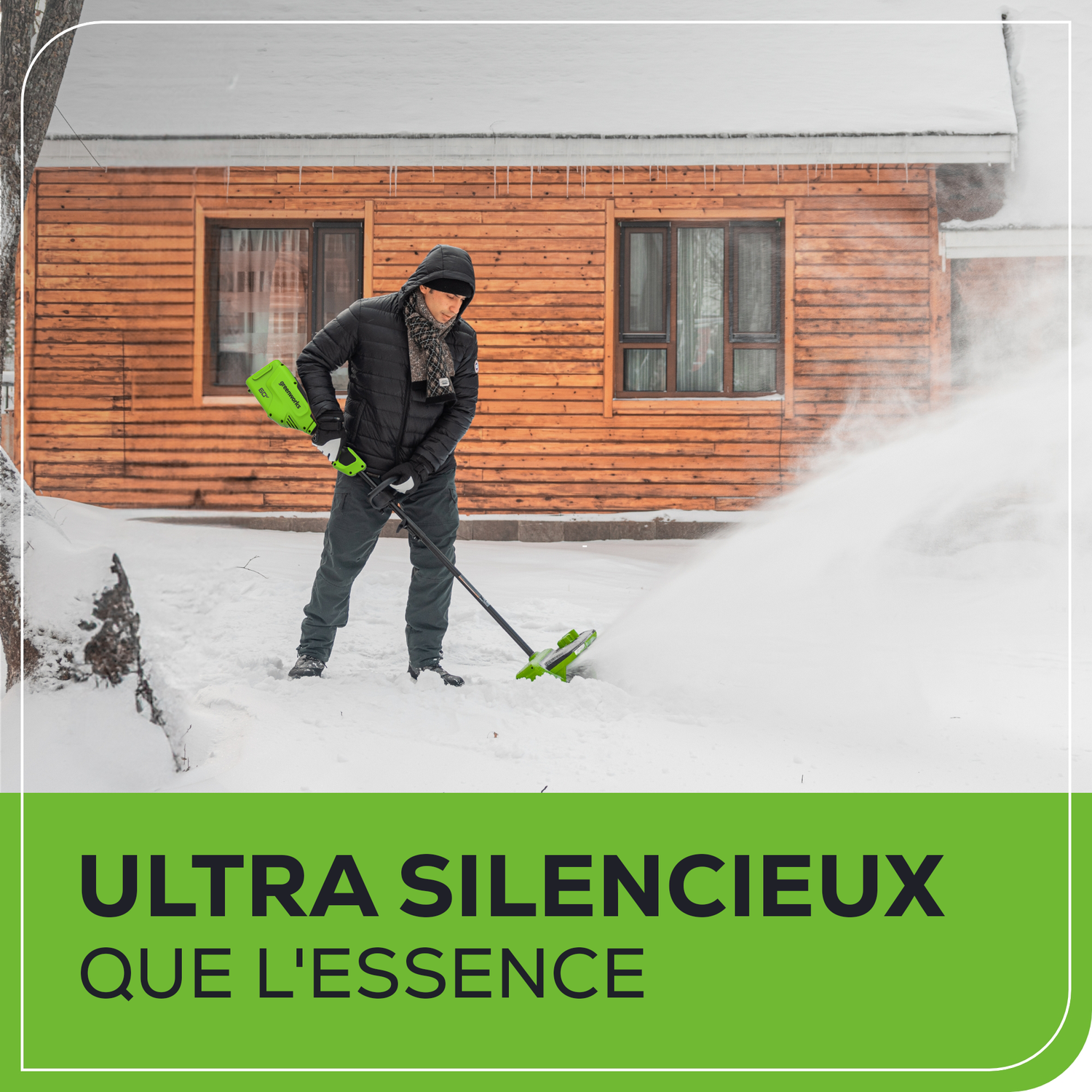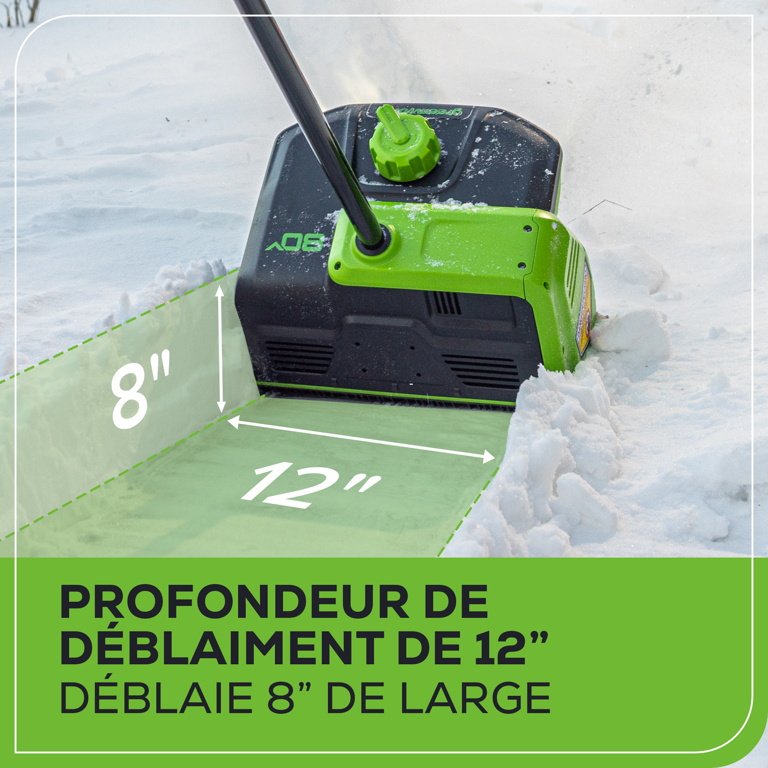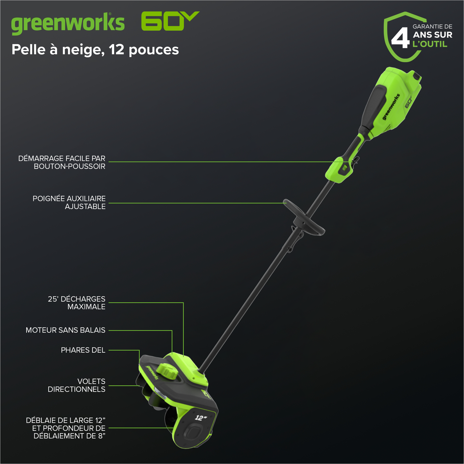 Bienvenue à La Vie. Propulsée. Par Greenworks. Déneigez vos trottoirs et entrées plus facilement cet hiver grâce à la pelle à neige sans fil Greenworks 60V de 30 cm. Dotée d'un moteur sans balais haute performance de 2 kW et d'une turbine à deux vitesses atteignant 1 800 tr/min, cette pelle à neige ne manquera pas de vous impressionner. Ses lumières DEL puissantes et son fonctionnement silencieux la rendent idéale pour une utilisation matinale ou nocturne. Alimentée par une batterie lithium-ion 60V, elle offre une largeur de déneigement de 30 cm (12 po.) et une profondeur de 20 cm (8 po.). Dites adieu à l'essence cet hiver et bonjour à Greenworks ! Cette pelle à neige est compatible avec le système Greenworks 60V, qui comprend plus de 75 outils et batteries. La gamme Greenworks 60 V est assortie d'une garantie limitée de 4 ans, protégeant ainsi votre investissement.