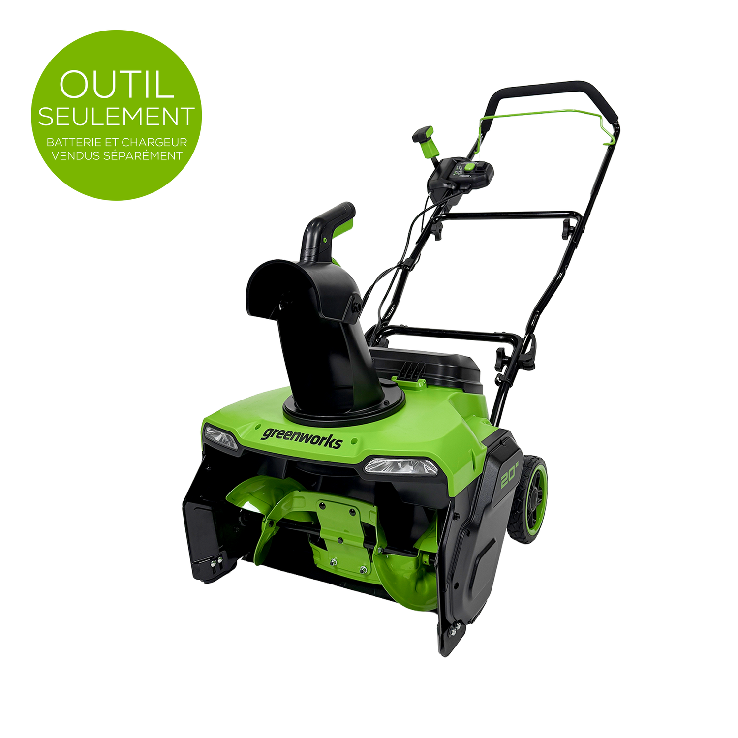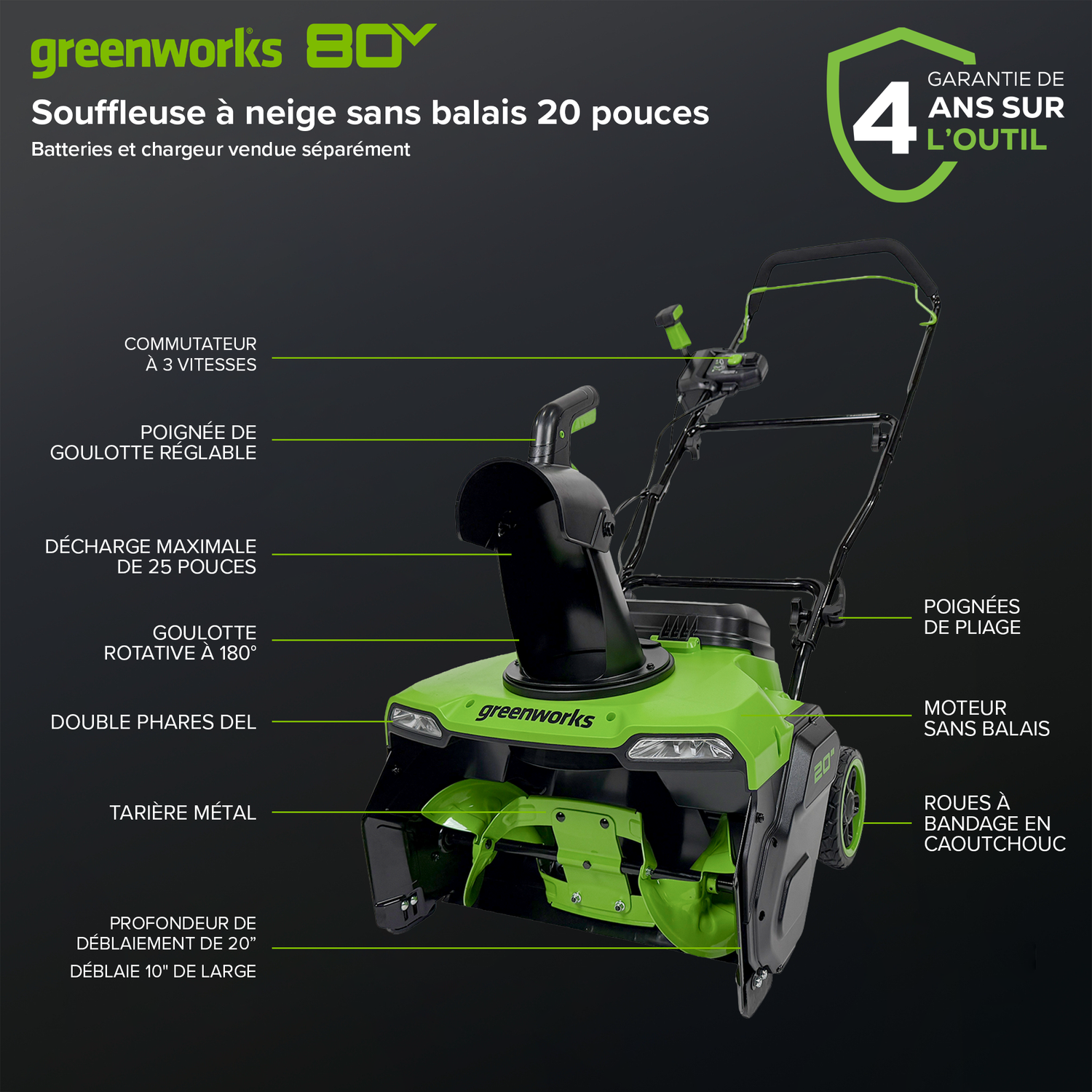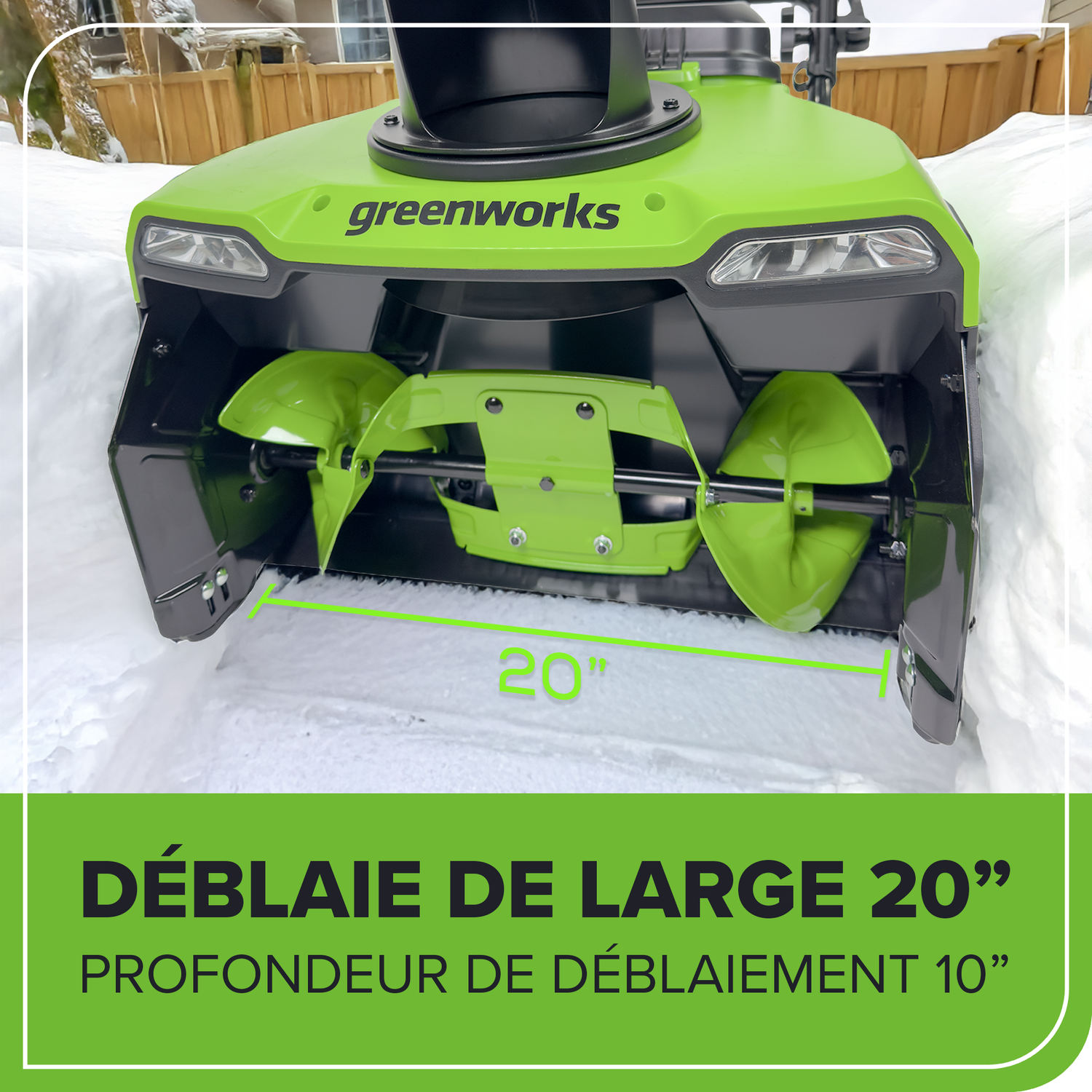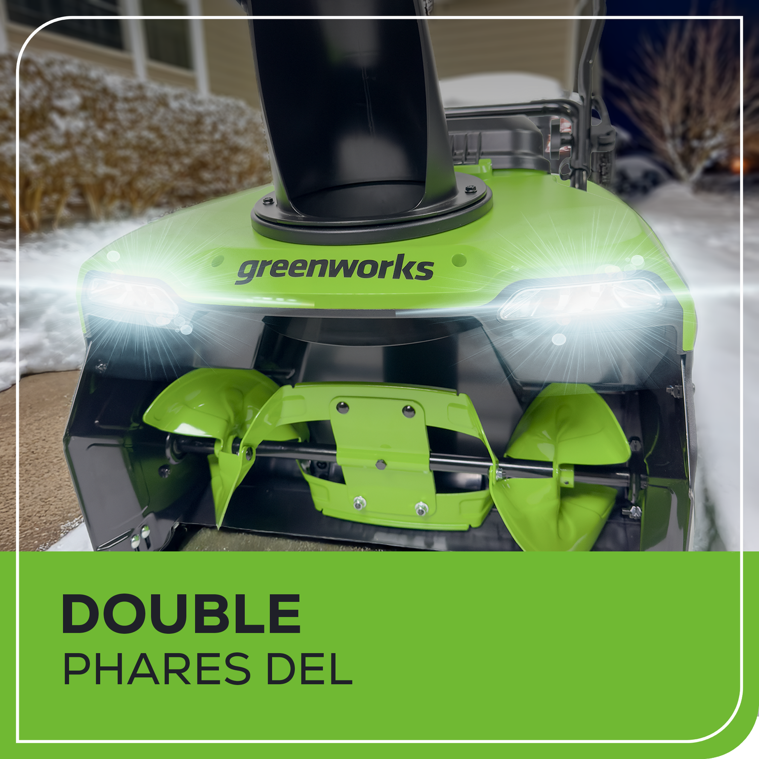 Bienvenue à La Vie. Propulsée. Par Greenworks. Idéale pour déneiger trottoirs, allées et terrasses, la souffleuse à neige sans fil Greenworks 60 V de 20 pouces est l'outil indispensable pour affronter l'hiver. Alimentée par une batterie 60 V (vendue séparément) pour une utilisation sans fil simplifiée, cette souffleuse à neige monobloc dégage une largeur de 50 cm (20 pouces) et une profondeur de 25 cm (10 pouces) grâce à sa tarière en acier à 3 vitesses, gage de durabilité. Compatible avec toutes les batteries Greenworks 60 V, elle est équipée d'un levier de rotation de la goulotte à 180° qui projette la neige jusqu'à 7,5 m (25 pieds) et d'une conception améliorée réduisant les fuites. Deux phares DEL éclairent votre chemin, tandis que les roues à bande de roulement en caoutchouc et la poignée réglable à 2 positions facilitent les manœuvres. Le système de poignée pliable permet un rangement et un transport rapides. Passez un hiver au chaud et sans effort grâce à la souffleuse à neige Greenworks 60 V, garantie 4 ans.