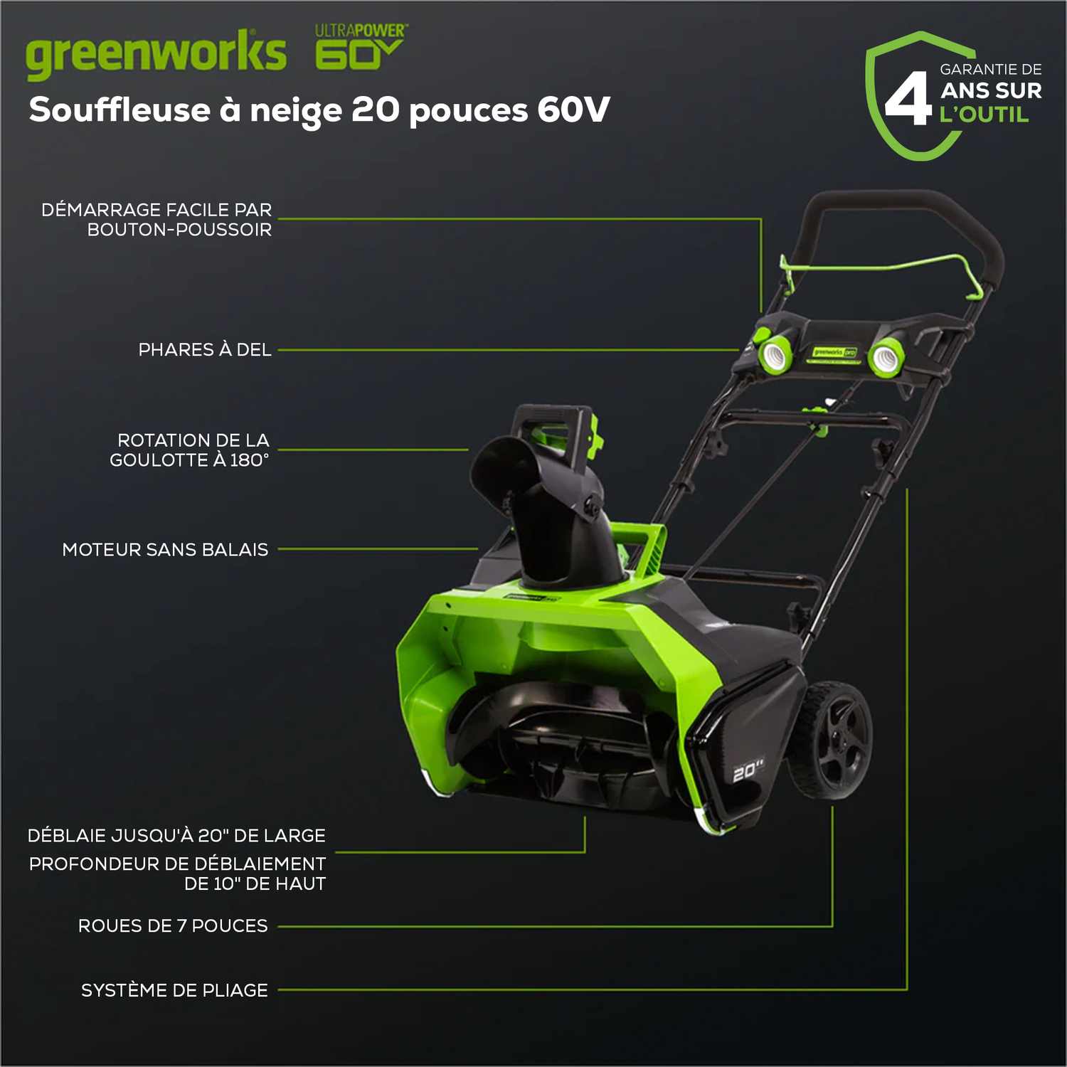 Bienvenue à La Vie. Propulsée. Par Greenworks. Idéale pour déneiger les trottoirs, les allées et les patios, cette souffleuse à neige Greenworks Pro 60 V est l'outil à avoir lorsque la neige tombe. Cette souffleuse à neige à phase unique est alimentée par une batterie de 60 V qui permet un fonctionnement sans fil facile et pratique ; commencez avec une trousse à outils, puis ajoutez un équipement contenant uniquement des outils. Cette souffleuse à neige est compatible avec toutes les batteries Greenworks 60V. Avec la goulotte rotative à 180°, vous pouvez projeter la neige jusqu'à 20' dans la direction souhaitée. Pour le dégagement de nuit, cette souffleuse est dotée de deux DEL pour augmenter la visibilité, et ses roues arrière de 7 po. la rendent facile à manœuvrer. De plus, son système de pliage convivial facilite le rangement ou le transport. Équipez-vous cet hiver du Greenworks Pro Souffleuse à neige 60 V et passez moins de temps à pelleter la neige et plus de temps à profiter d'un feu chaud. Bénéficiant d'une garantie de 4 ans, cette souffleuse à neige est construite pour une durabilité durable, garantissant qu'elle reste fiable pour les années à venir.