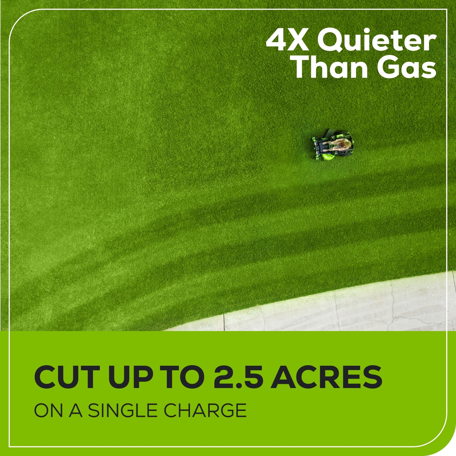 Passez de l'odeur, des tracas et de l'entretien du gaz à la tondeuse électrique ZTR alimentée par batterie Greenworks 60 V. Avec quatre moteurs intelligents sans balais alimentés par (6) batteries 60 V 8,0 Ah, cette tondeuse délivre une puissance équivalente à 24 chevaux. Le plateau en acier estampé durable de 42 po est équipé de deux lames en acier coupées avec précision qui offrent des hauteurs de coupe réglables de 1,5 po à 4,5 po. La surface de chargement intégrée offre une polyvalence en déplacement et transporte jusqu'à 200 lb. Greenworks 42 po La tondeuse à gazon Zero Turn 60 V et six (6) batteries 60 V 8,0 Ah incluses sont compatibles avec le système Greenworks 60 V de plus de 75 outils et bénéficient d'une garantie de 4 ans.